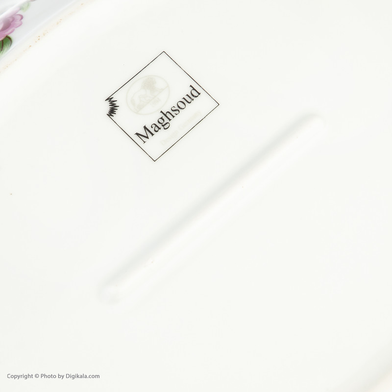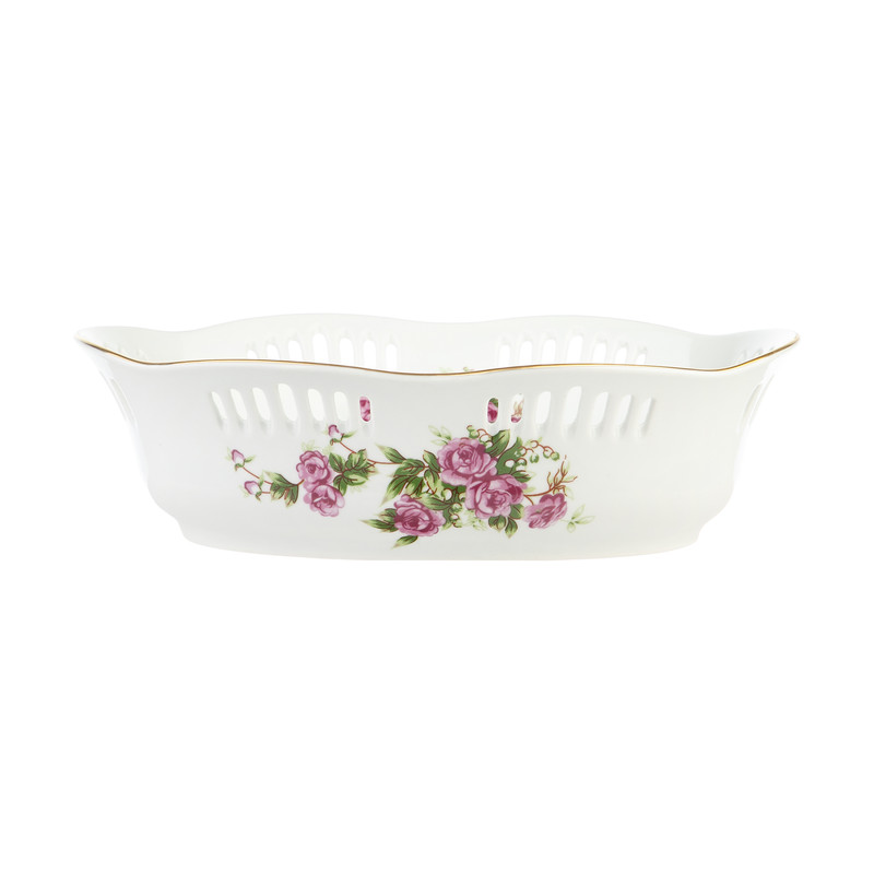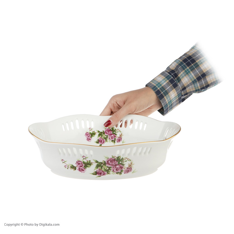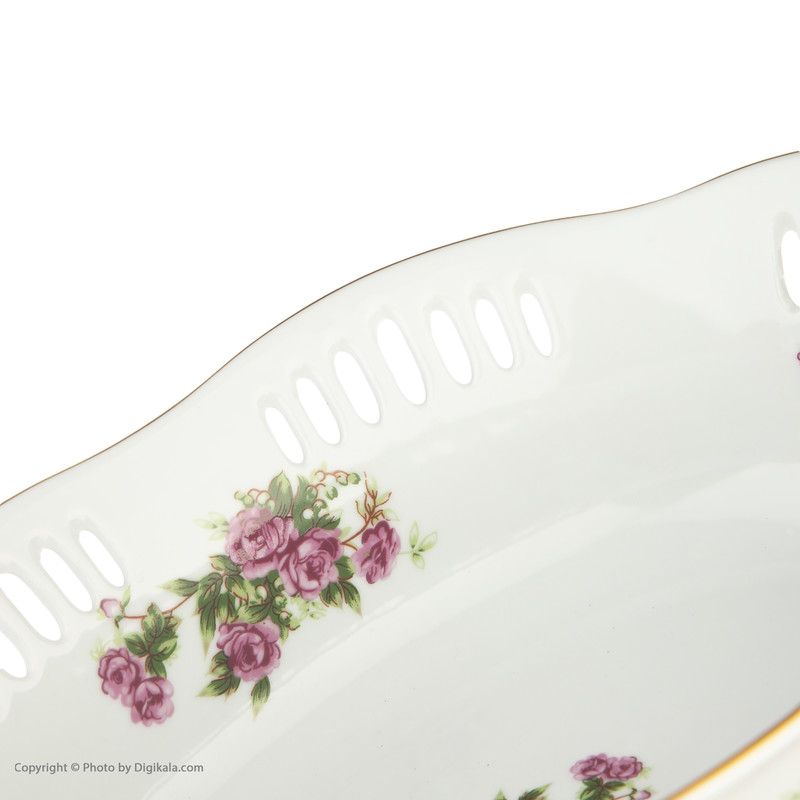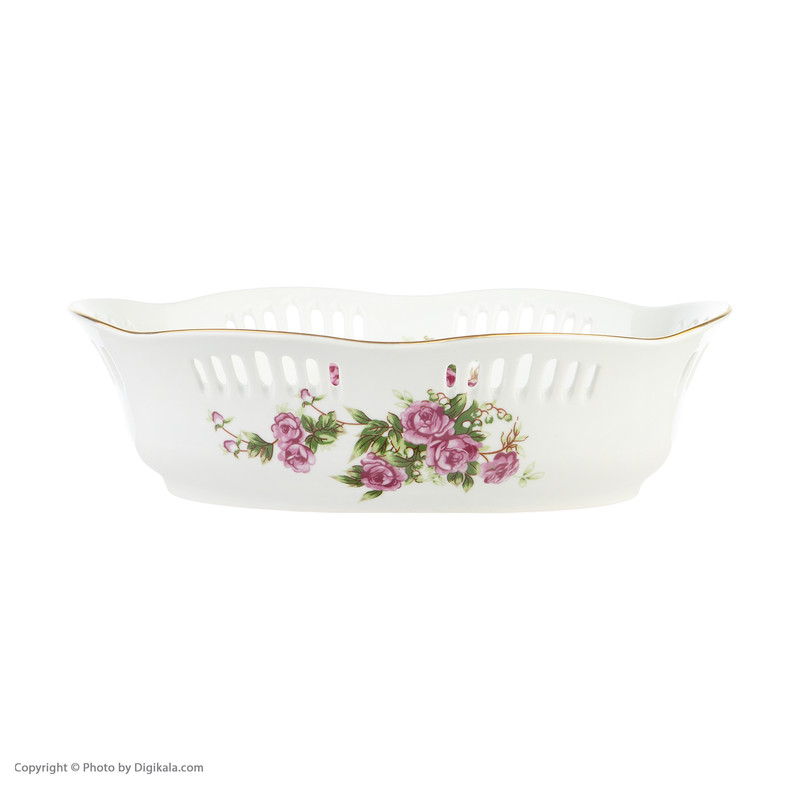 کاسه آجیل خوری بیضی توری لب طلا طرح گل سرخی تولید شرکت چینی مقصود باجعبه کادویی با پخت کوره ای و رنگ ثابت