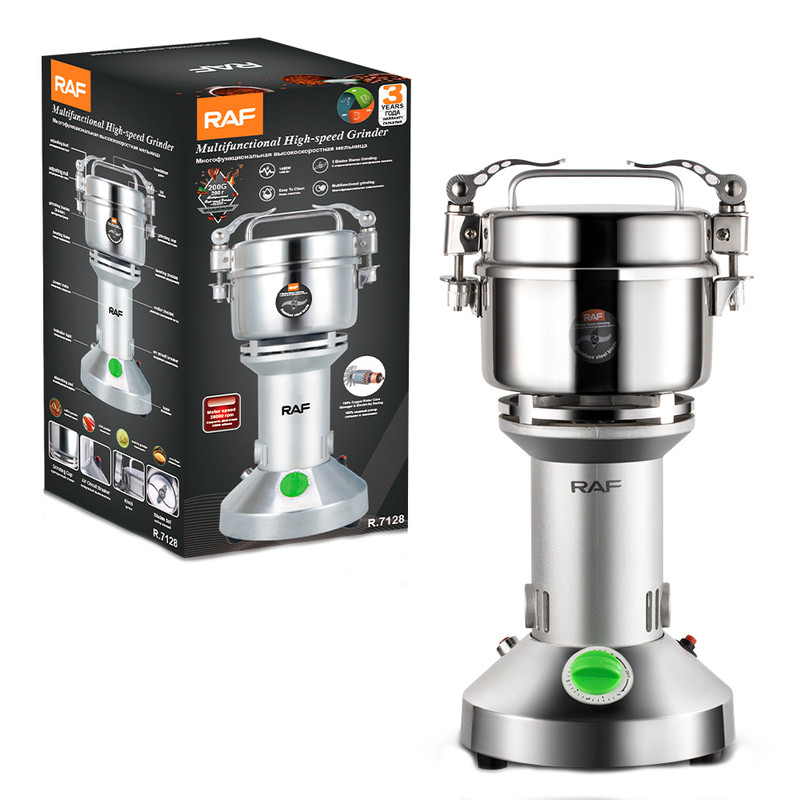 آسیاب صنعتی پر قدرت راف مدل R.7128 با توان مصرفی 1480 وات و ظرفیت 200 گرم.