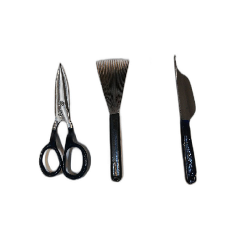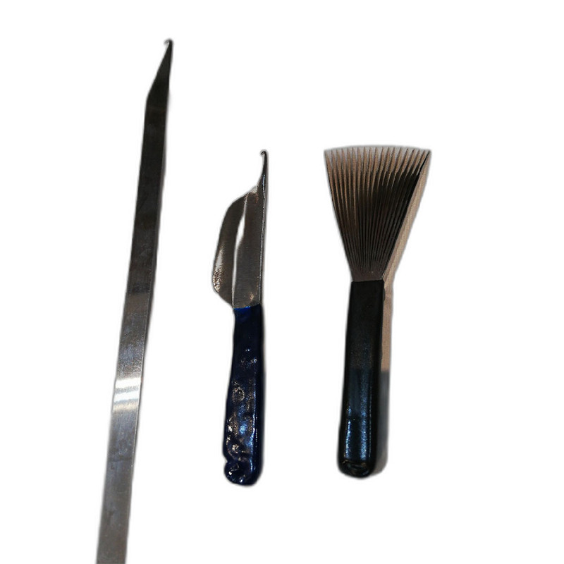 ابزار بافت فرش و تابلو فرش گلیم بافی که شامل دفه، قیچی ترکی سیخ (پودکش) و قلاب قالی بافی برای بافت هر نوع بافت داری استفاده می شود از استیل و دسته چرمی