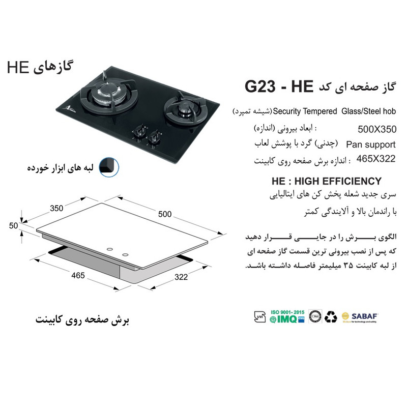 سایز اجاق گاز: طول: 50 سانتی متر عرض: 35 سانتی متر - تعداد شعله : 2 شعله - نمای ظاهری: شیشه مشکی - جنس صفحه : شیشه - جنس شبکه: چدن - جنس ولوم: باکالیت - شعله پلوپز: دارد - جرقه زن اتوماتیک: دارد - ترموکوبل - تاپ تایم: دارد - قطعات اصلی: ولوم، جرقه زن ، ترموکوبل ، سرشعله ساخت ایتالیا - ابعاد برش را در قسمت تصاویر میتوانید مشاهده بفرمایید.