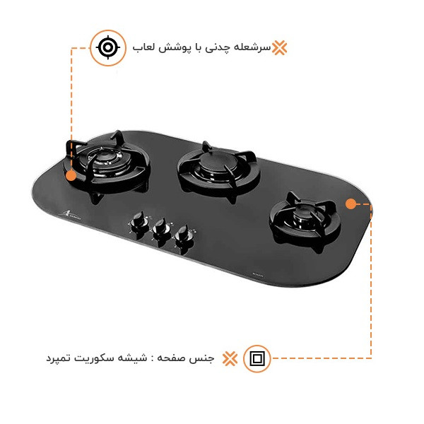 سایز اجاق گاز: طول: 73 سانتی متر عرض: 43 سانتی متر - تعداد شعله : 3 شعله - نمای ظاهری: شیشه مشکی - جنس صفحه : شیشه - جنس شبکه: چدن - جنس ولوم: باکالیت - شعله پلوپز: دارد - جرقه زن اتوماتیک: دارد - ترموکوبل - تاپ تایم: دارد - قطعات اصلی: ولوم، جرقه زن ، ترموکوبل ، سرشعله ساخت ایتالیا