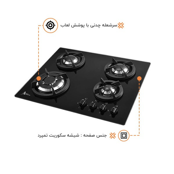 سایز اجاق گاز: طول: 62 سانتی متر عرض: 51.5 سانتی متر - تعداد شعله : 4 شعله - نمای ظاهری: شیشه مشکی - جنس صفحه : مشکی - جنس شبکه: چدن - جنس ولوم: باکالیت - شعله پلوپز: دارد - جرقه زن اتوماتیک: دارد - ترموکوبل تاپ تایم: دارد - قطعات اصلی: ولوم ، جرقه زن ، ترموکوبل ، سرشعله SABAF سری 3 ساخت ایتالیا