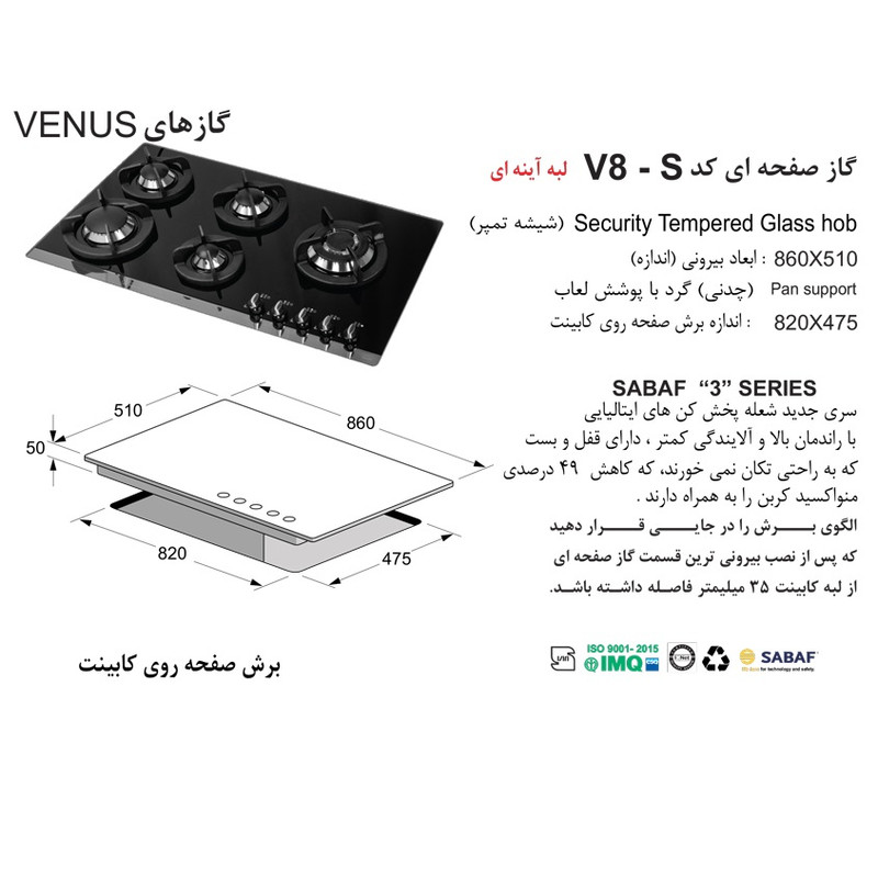 سایز اجاق گاز: طول: 86 سانتی متر عرض: 50 سانتی متر - تعداد شعله : 5 شعله - نمای ظاهری: شیشه مشکی - جنس صفحه : شیشه - جنس شبکه: چدن - جنس ولوم: باکالیت - شعله پلوپز: دارد - جرقه زن اتوماتیک: دارد - ترموکوبل تاپ تایم: دارد - قطعات اصلی: ولوم ، جرقه زن ، ترموکوبل ، سرشعله SABAF سری 3 ساخت ایتالیا
