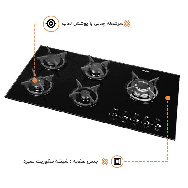 سایز اجاق گاز: طول: 90 سانتی متر عرض: 51 سانتی متر- تعداد شعله : 5 شعله - نمای ظاهری: شیشه مشک - جنس صفحه : شیشه - جنس شبکه: چدن - جنس ولوم: باکالیت - نوع سوخت: گاز - شعله پلوپز: دارد - جرقه زن اتوماتیک: دارد - ترموکوبل تاپ تایم: دارد - قطعات اصلی: ولوم، جرقه زن ، ترموکوبل ، سرشعله ساخت ایران