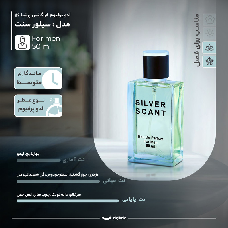 ادو پرفیوم مردانه فراگرنس پرشیا 116 مدل سیلور سنت با رایحه گرم و شیرین حجم 50 میلی لیتر