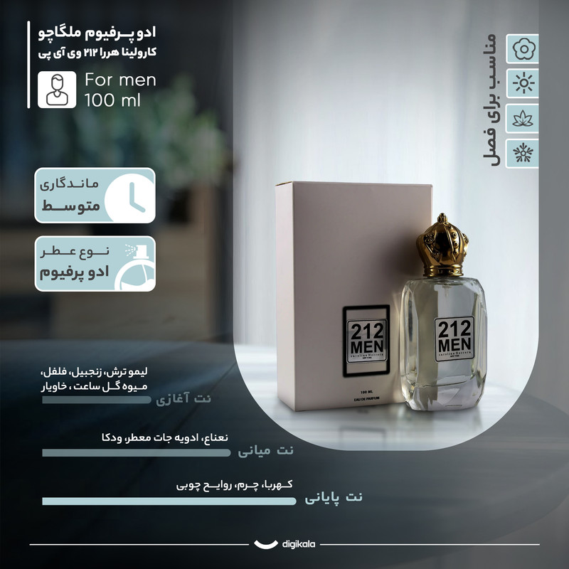 ادو پرفیوم مردانه ملگاچو مدل کارولینا هررا 212 وی آی پی با رایحه گرم حجم 100 میلی لیتر