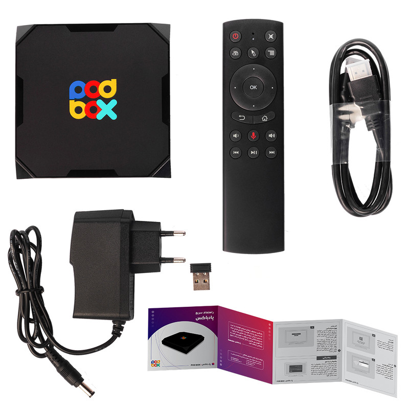 ریموت کنترل ایرموس، دانگل ریموت کنترل ایرموس، آداپتور، کابل HDMI، دفترچه راهنمای سریع، پک باتری