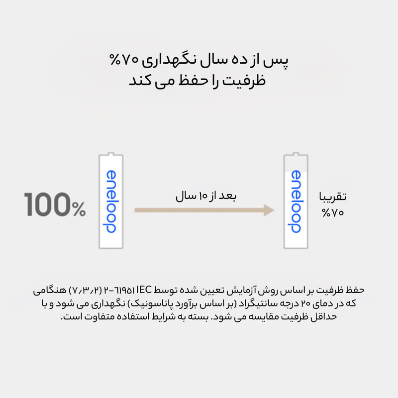 تا 70 درصد از شارژ خود را پس از 10 سال حفظ می کند (در صورت عدم استفاده)