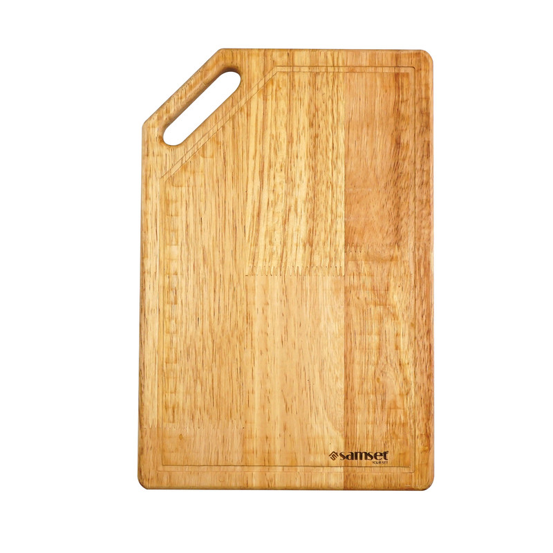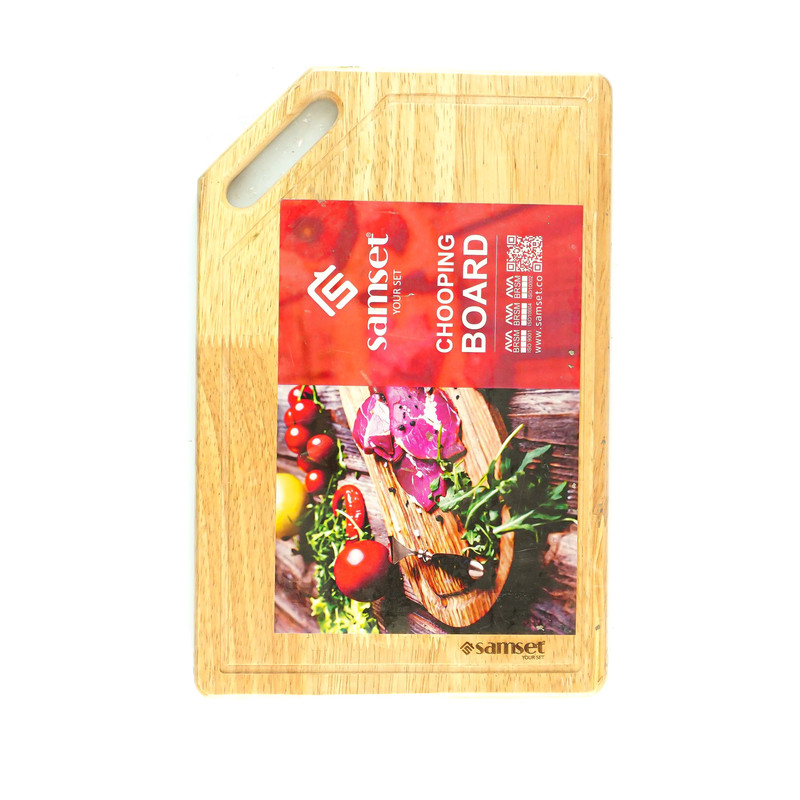 تخته گوشت چوبی سام ست با طراحی دستهدار و شیار ضدنشتی، از چوب طبیعی مقاوم ساخته شده و مناسب برش گوشت، مرغ است