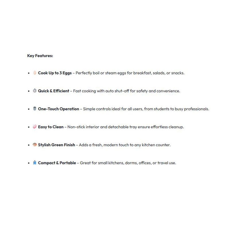 ظرفیت ۳ تخممرغ | توان ۲۱۰ وات | مخزن آب ۱۰۰ میلیلیتر | طراحی جمعوجور | جنس بدنه: پلاستیک PC مقاوم و بدون BPA | جنس سینی: ترکیب پلاستیک PP و استیل ضدزنگ با پوشش نچسب | پوشش نچسب و تایمر ۸ تا ۱۵ دقیقهای | فنجان اندازهگیری و دفترچه راهنما | خاموشی خودکار: ایمنی بیشتر و جلوگیری از پخت بیش از حد تخممرغ