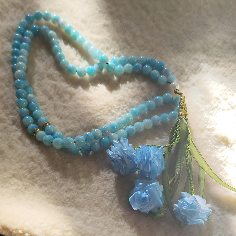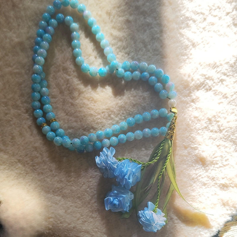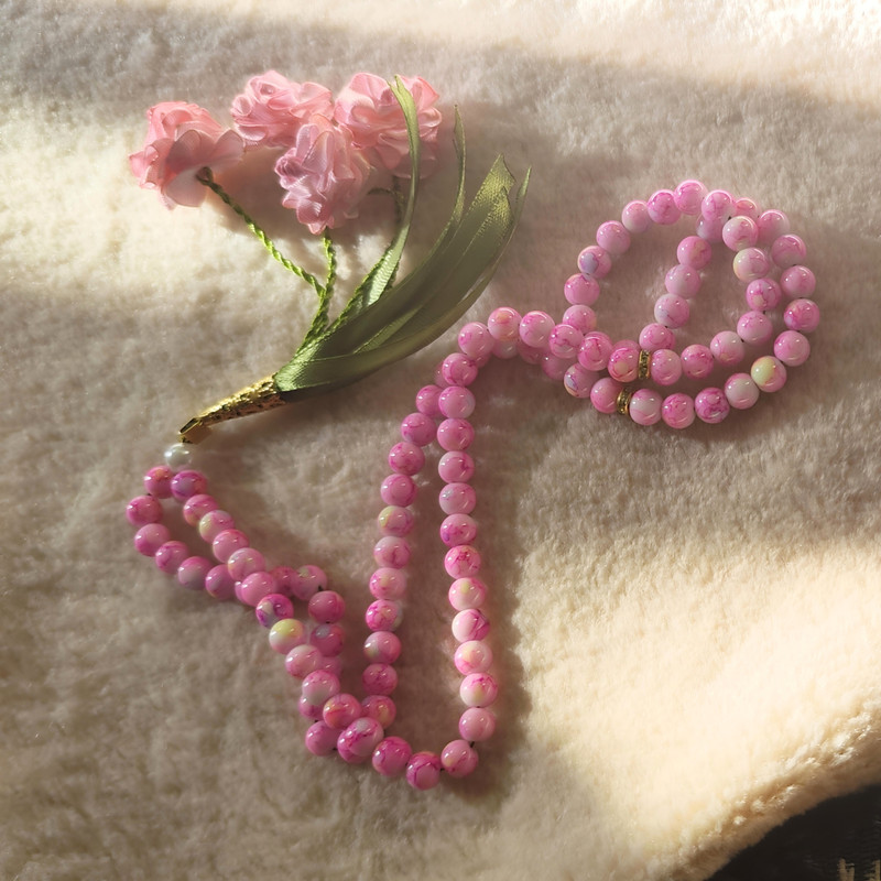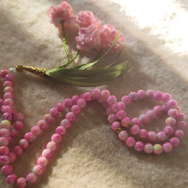 تسبیح دست ساز با نخ بسیار محکم و متریال عالی با گل های روبان دوزی شده طرح میخک مناسب شیک پسندان