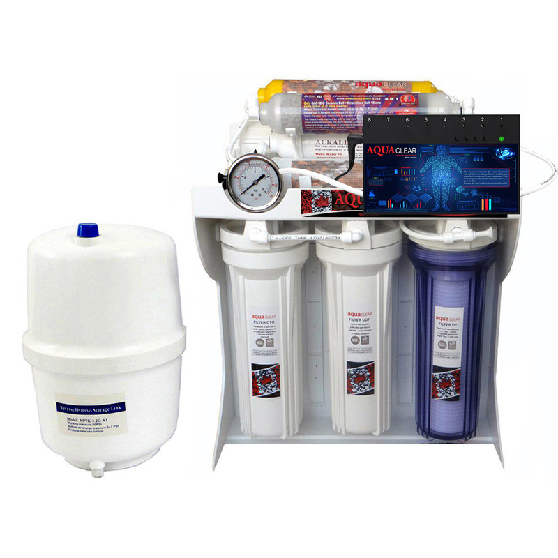 تصفیه آب خانگی 8 مرحله ای مجهز به سیستم هوش مصنوعی با روش اسمز معکوس- قلیایی ساز - مکمل 4 در 1 و دارای فیلتر املاح معدنی اضافه کننده املاح مورد نیاز بدن