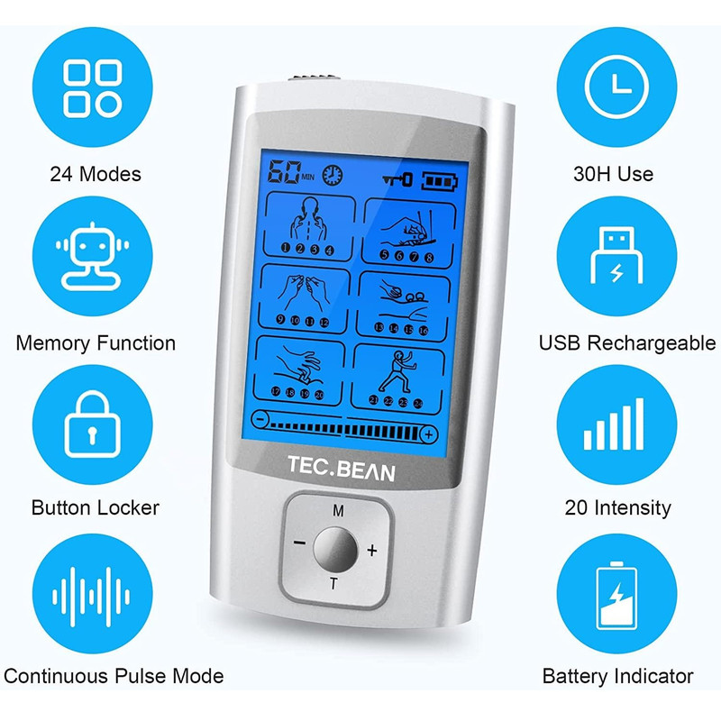 دستگاه ماساژور TEC.Bean Tens برای مدیریت درد و توانبخشی با 24 حالت و 8 پد، ماساژور ضربهای پالسی، عالی برای درمان درد و تسکین عضلات