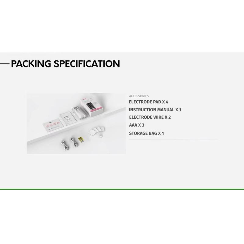 2 جفت پد الکترود – سیم الکترود ۲ سر ۲ عدد – 3عدد باتری – کیف جیر – صفحه راهنمای انگلیسی
