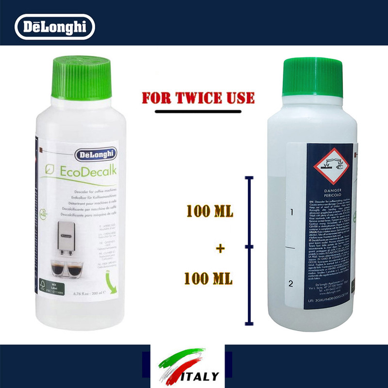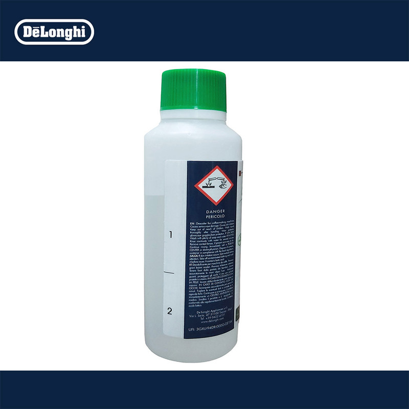 محلول جرم گیر و رسوب زدا با حجم 200 میلی لیتر - علاوه بر اسپرسوساز های مارک دلونگی برای تمامی دستگاههای اسپرسو ساز مناسب میباشد - برای اسپرسوسازهای دلونگی توصیه شده در صورت استفاده مداوم بسته به قدرت و نوع دستگاه (خانگی یا حرفه ایی) و همچنین سختی آب استفاده شده از یک تا دو ماه یکبار رسوب زدایی شوند - ظرفیت بطری/قوطی 250 میلی لیتر میباشد که 200 میلی لیتر آن (حدود 80 درصد) پر شده است - درب بطری/قوطی پلمپ پیچی میباشد و رطوبت بین درپوش و پایه درب مایعی برای آب بندی بطری میباشد.