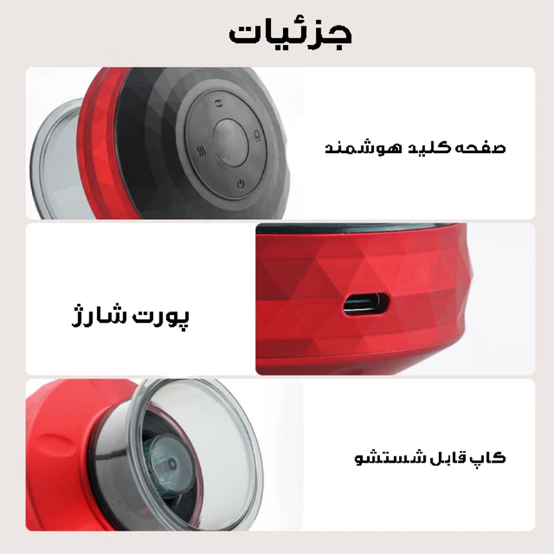 بادکش شارژی ، دارای 12 سطح شدت مکش ، توان 5 وات ، دارای صفحه نمایش دیجیتال ( صفحه نمایش به صورت عددی نمی باشد به صورت نقطه ای است )، اقلام همراه کالا دو عدد فیلتر گرد و کابل شارژ و دفترچه راهنما