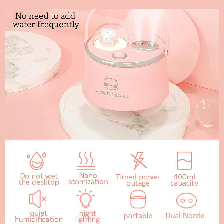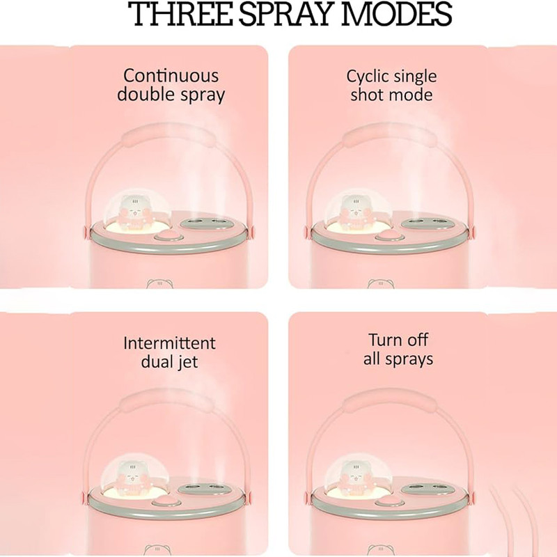 ورودی: ۵ ولت - ۱ آمپر - دارای حالت چراغ خواب برای روشن سازی محیط اطراف در شب - ظرفیت: ۴۰۰ میلی لیتر ،حالت اسپری دوگانه به مدت ۵ ساعت ادامه دارد - حالت اسپری سوئیچ چپ و راست ۱۰ ساعت طول می کشد (حالت متناوب اسپری دوگانه به مدت ۱۰ ساعت ادامه دارد)