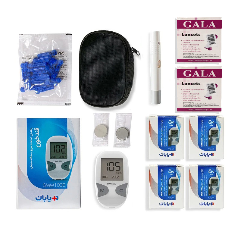 دستگاه تست قند خون دیابان مدل SMM1000 به همراه 4 بسته نوار 50 عددی و 2 بسته 100 عددی سوزن لنست گالا