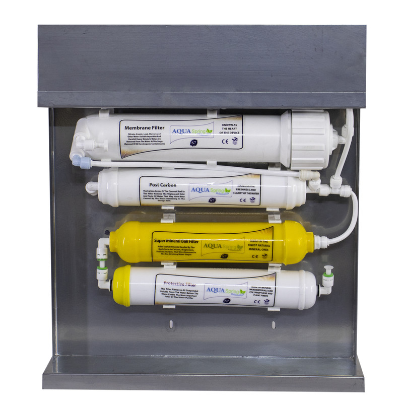 فیلتر(PP) :حذف ذرات معلق ،شن و ماسه گل لای و زنگ لوله _ فیلتر (UDF) : تهیه شده از کربن پوسته نارگیل جهت حذف کلر و آلاینده های شیمیایی _فیلتر (CTO) :تکمیل کننده مرحله دوم _فیلتر (MEMBERAN): اصلی ترین فیلتر دستگاه جهت حذف ویروس ها و میکرو ارگانیسم هایی نظیر نیترات نیتریت آرسنیک و فلزات سنگین و... _فیلتر (POST CARBON): این فیلتر تاثیرات ناشی از ماندگاری آب در مخزن را از بین برده و جهت بهبود طعم و مزه میباشد_فیلتر (MINERAL) :جهت اضافه نمودن املاح مورد نیاز بدن _فیلتر محافظ ممبراین که این فیلتر قبل ورود آب به فیلتر ممبراین املاح و سختی را حذف نموده و موجب افزایش طول عمر فیلتر ممبراین خواهد شد.