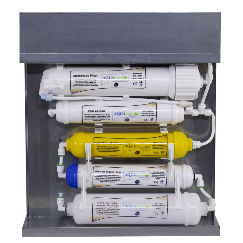 فیلتر(PP) :حذف ذرات معلق ،شن و ماسه گل لای زنگ لوله _ فیلتر (UDF) : تهیه شده از کربن پوسته نارگیل جهت حذف کلر و آلاینده های شیمیایی _فیلتر (CTO) :تکمیل کننده مرحله دوم _فیلتر (MEMBERAN): اصلی ترین فیلتر دستگاه جهت حذف ویروس ها و میکرو ارگانیسم هایی نظیر نیترات نیتریت آرسنیک و فلزات سنگین و... _فیلتر (POST CARBON): این فیلتر تاثیرات ناشی از ماندگاری آب در مخزن را از بین برده و جهت بهبود طعم و مزه میباشد_فیلتر (MINERAL) :جهت اضافه نمودن املاح مورد نیاز بدن _ فیلتر قلیایی ساز جهت تنظیم PH آب (افزایش سیستم ایمنی بدن ، سلامت پوست و مو ، سم زدایی بدن و .....) _و فیلتر نانو ذرات گیاهی گیاهان به دلیل داشتن خاصیت آنتی اکسیدانی بالا و استحکام بالا دربرابر مواد شیمیایی نقش بسزایی جهت از بین بردن میکروبها و ویروس ها دارند.به همراه فیلتر یدک 1 و 2 و 3 و 4 میباشد.