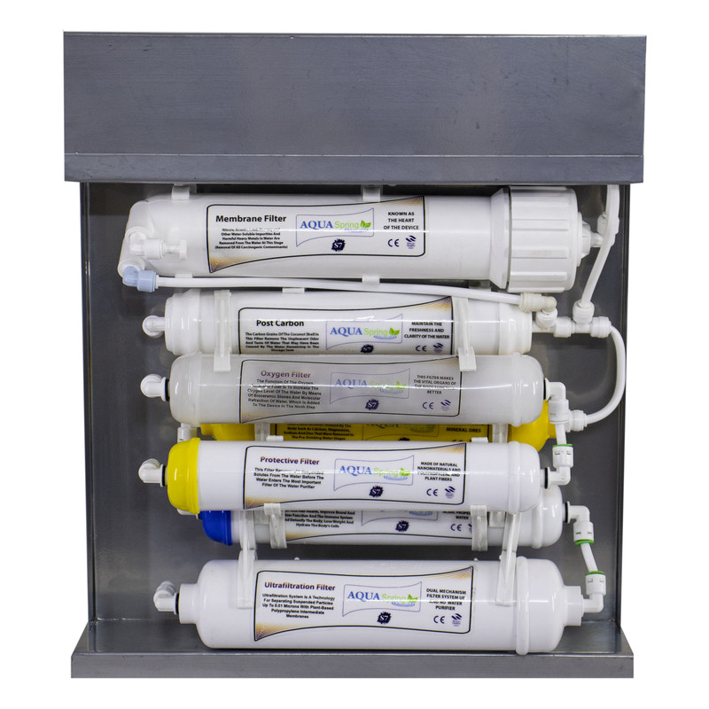 فیلتر(PP) :حذف ذرات معلق ،شن و ماسه گل لای زنگ لوله _ فیلتر (UDF) : تهیه شده از کربن پوسته نارگیل جهت حذف کلر و آلاینده های شیمیایی _فیلتر (CTO) :تکمیل کننده مرحله دوم _فیلتر (MEMBERAN): اصلی ترین فیلتر دستگاه جهت حذف ویروس ها و میکرو ارگانیسم هایی نظیر نیترات ، نیتریت آرسنیک و فلزات سنگین و... _فیلتر (POST CARBON): این فیلتر تاثیرات ناشی از ماندگاری آب در مخزن را از بین برده و جهت بهبود طعم و مزه میباشد_فیلتر (MINERAL) :جهت اضافه نمودن املاح مورد نیاز بدن _ فیلتر قلیایی ساز جهت تنظیم PH آب (افزایش سیستم ایمنی بدن ، سلامت پوست و مو ، سم زدایی بدن و ...) _فیلتر اکسیژن ساز به وسیله سنگ های بیوسرامیکی و شکست مولکولی سطح میزان اکسیژن آب را افزایش می دهد_فیلتر محافظ ممبراین :این فیلتر قبل از ورود آب به ممبراین املاح و سختی را حذف نموده و منجر به افزایش طول عمر فیلتر ممبراین خواهد شد _ فیلتر اولترافیلتراسیون (UF): سیستم جداسازی ذرات معلق تا 01/0 میکرون باغشاهای میان تهی ازجنس پلی پروپلین برپایه گیاهی گفته میشود.