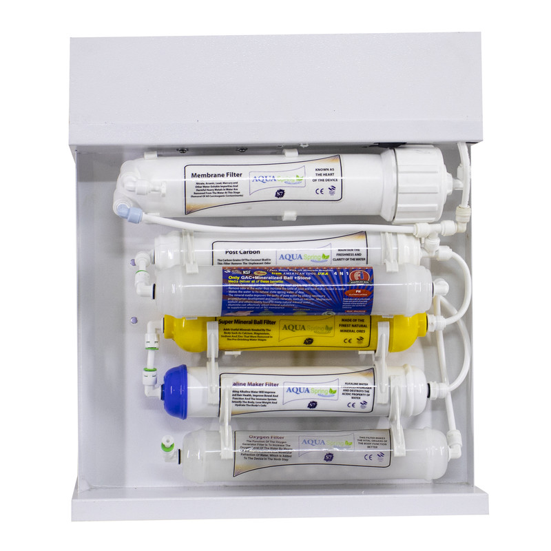فیلتر(PP) :حذف ذرات معلق ،شن و ماسه گل لای زنگ لوله _ فیلتر (UDF) : تهیه شده از کربن پوسته نارگیل جهت حذف کلر و آلاینده های شیمیایی _فیلتر (CTO) :تکمیل کننده مرحله دوم _فیلتر (MEMBERAN): اصلی ترین فیلتر دستگاه جهت حذف ویروس ها و میکرو ارگانیسم هایی نظیر نیترات ، نیتریت آرسنیک و فلزات سنگین و... _فیلتر (POST CARBON): این فیلتر تاثیرات ناشی از ماندگاری آب در مخزن را از بین برده و جهت بهبود طعم و مزه میباشد_فیلتر (MINERAL) :جهت اضافه نمودن املاح مورد نیاز بدن _ فیلتر قلیایی ساز جهت تنظیم PH آب (افزایش سیستم ایمنی بدن ، سلامت پوست و مو ، سم زدایی بدن و .....)_فیلتر اکسیژن ساز به وسیله سنگ های بیوسرامیکی و شکست مولکولی سطح میزان اکسیژن آب را افزایش می دهد_فیلتر 1x3 از سه نوع مواد تشکیل شده است، زغال اکتیو جهت بهبود طعم و مزه ، سنگ بیو سرامیک و سنگ مینرال مواد معدنی جهت افزودن املاح مورد نیاز بدن به آب مورد استفاده قرار میگیرد.