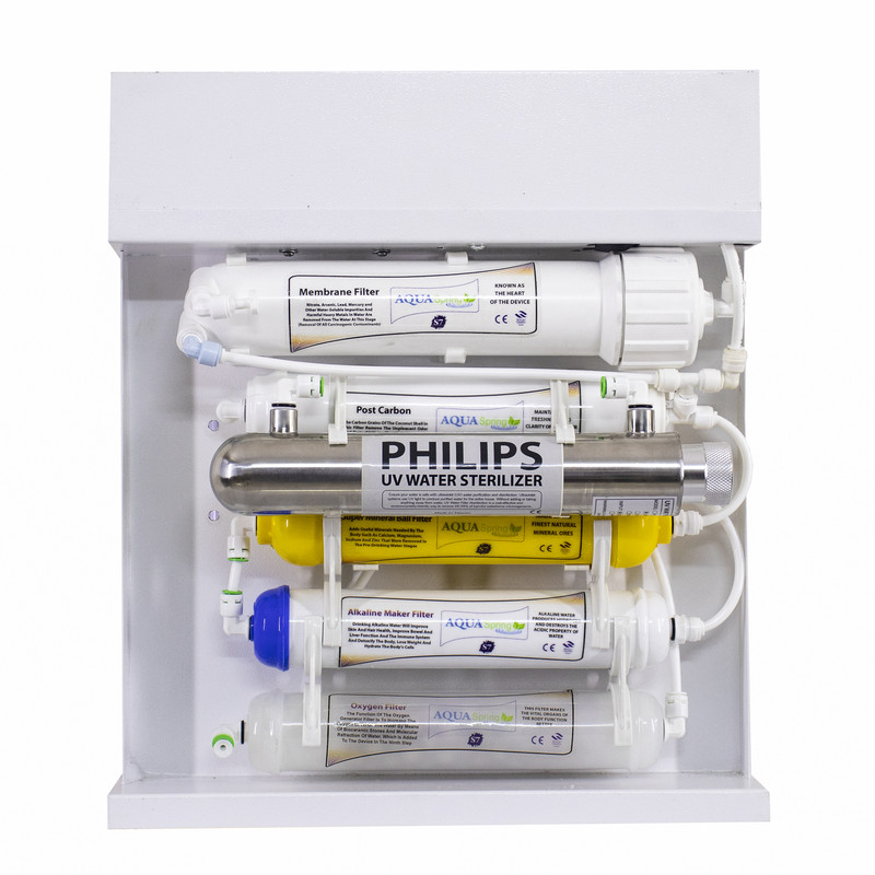 فیلتر(PP) :حذف ذرات معلق ،شن و ماسه گل لای زنگ لوله _ فیلتر (UDF) : تهیه شده از کربن پوسته نارگیل جهت حذف کلر و آلاینده های شیمیایی _فیلتر (CTO) :تکمیل کننده مرحله دوم _فیلتر (MEMBERAN): اصلی ترین فیلتر دستگاه جهت حذف ویروس ها و میکرو ارگانیسم هایی نظیر نیترات ، نیتریت آرسنیک و فلزات سنگین و... _فیلتر (POST CARBON): این فیلتر تاثیرات ناشی از ماندگاری آب در مخزن را از بین برده و جهت بهبود طعم و مزه میباشد_فیلتر (MINERAL) :جهت اضافه نمودن املاح مورد نیاز بدن _ فیلتر قلیایی ساز جهت تنظیم PH آب (افزایش سیستم ایمنی بدن ، سلامت پوست و مو ، سم زدایی بدن و .....) _و فیلتر اولترافیلتراسیون : سیستم جداسازی ذرات معلق تا 01/0 میکرون باغشاهای میان تهی ازجنس پلی پروپلین برپایه گیاهی گفته میشود _ فیلتر ماورا بنفش (UV) طبق بررسی های به عمل آمده در استاندارد های بین المللی هیچگونه اثر سوء و منفی بر روی بدن انسان ندارد بلکه تنها باعث از بین بردن کلیه میکروبها و انگلها و ویروس ها و میکروارگانیسم ها مضر شیمیایی به طوری 100 برابر می شود- به همراه فیلتر یدک 1 و2 و 3 و 4