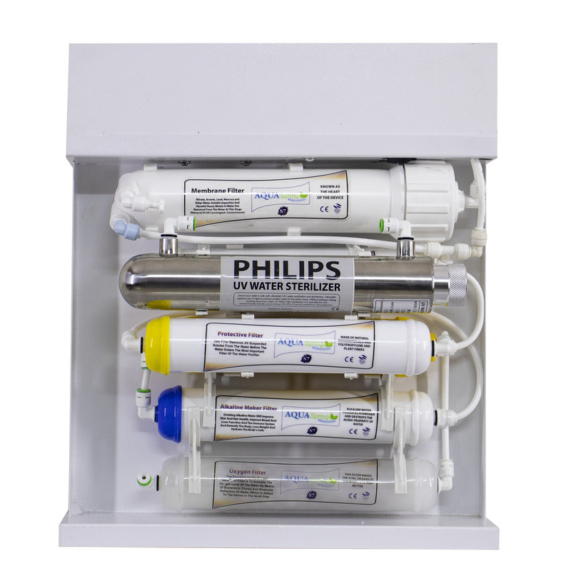 فیلتر(PP) :حذف ذرات معلق ،شن و ماسه گل لای زنگ لوله _ فیلتر (UDF) : تهیه شده از کربن پوسته نارگیل جهت حذف کلر و آلاینده های شیمیایی _فیلتر (CTO) :تکمیل کننده مرحله دوم _فیلتر (MEMBERAN): اصلی ترین فیلتر دستگاه جهت حذف ویروس ها و میکرو ارگانیسم هایی نظیر نیترات ، نیتریت آرسنیک و فلزات سنگین و... _فیلتر (POST CARBON): این فیلتر تاثیرات ناشی از ماندگاری آب در مخزن را از بین برده و جهت بهبود طعم و مزه میباشد_فیلتر (MINERAL) :جهت اضافه نمودن املاح مورد نیاز بدن _ فیلتر قلیایی ساز جهت تنظیم PH آب (افزایش سیستم ایمنی بدن ، سلامت پوست و مو ، سم زدایی بدن و .....)_فیلتر اکسیژن ساز : به وسیله سنگ های بیوسرامیکی و شکست مولکولی سطح میزان اکسیژن آب را افزایش می دهد_فیلتر محافظ ممبراین :این فیلتر قبل از ورود آب به ممبراین املاح و سختی را حذف نموده و منجر به افزایش طول عمر فیلتر ممبراین خواهد شد_
