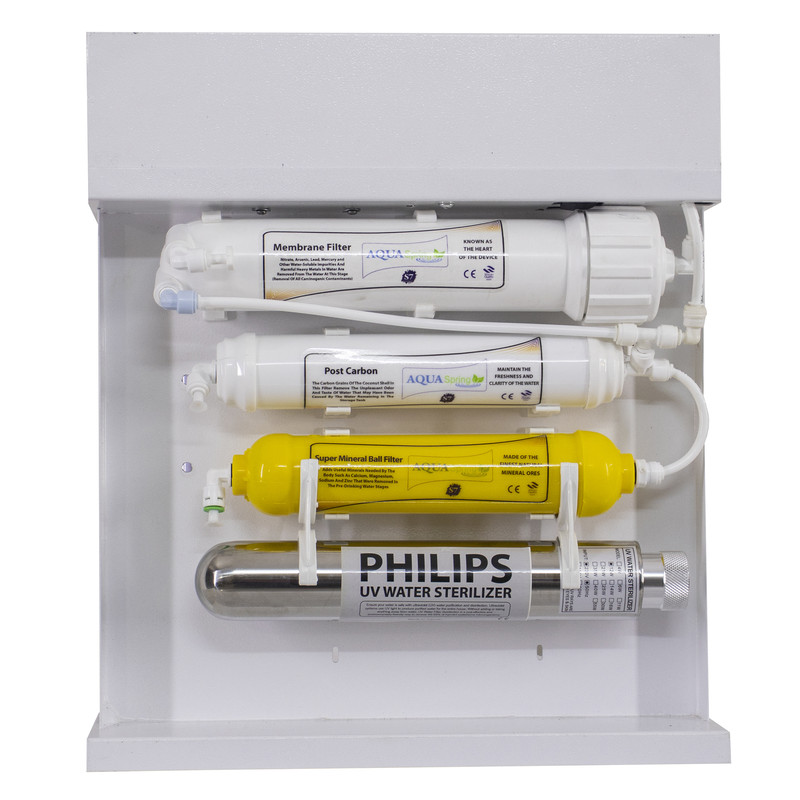 فیلتر(PP) :حذف ذرات معلق ،شن و ماسه گل لای زنگ لوله _ فیلتر (UDF) : تهیه شده از کربن پوسته نارگیل جهت حذف کلر و آلاینده های شیمیایی _فیلتر (CTO) :تکمیل کننده مرحله دوم _فیلتر (MEMBERAN): اصلی ترین فیلتر دستگاه جهت حذف ویروس ها و میکرو ارگانیسم هایی نظیر نیترات نیتریت آرسنیک و فلزات سنگین و... _فیلتر (POST CARBON): این فیلتر تاثیرات ناشی از ماندگاری آب در مخزن را از بین برده و جهت بهبود طعم و مزه میباشد_فیلتر (MINERAL) :جهت اضافه نمودن املاح مورد نیاز بدن _ -فیلتر ماورا بنفش (UV): طبق بررسی های به عمل آمده در استاندارد های بین المللی هیچگونه اثر سوء و منفی بر روی بدن انسان ندارد بلکه تنها باعث از بین بردن کلیه میکروبها و انگلها و ویروس ها و میکروارگانیسم ها مضر شیمیایی به طوری 100 برابر می شود.