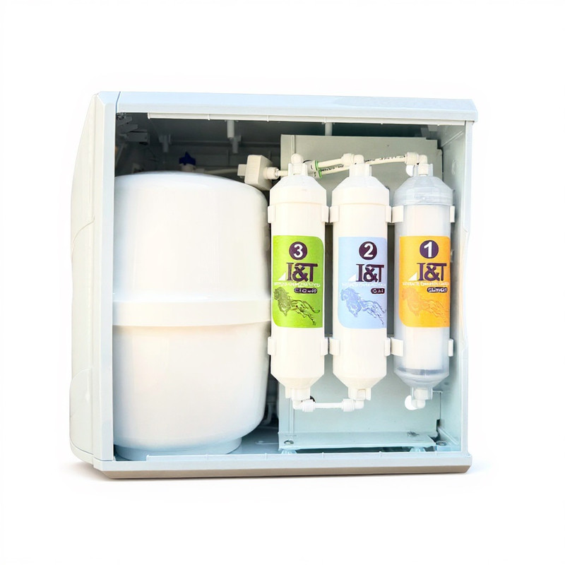 فیلتر الیافی (PP – مرحله اول) - فیلتر کربن فعال پودری (GAC - مرحله دوم) - فیلتر الیافی (PP – مرحله سوم) - فیلتر ممبران (RO – مرحله چهارم) - فیلتر پستکربن (Post Carbon – مرحله پنجم) - فیلتر مینرال (Mineral – مرحله ششم)