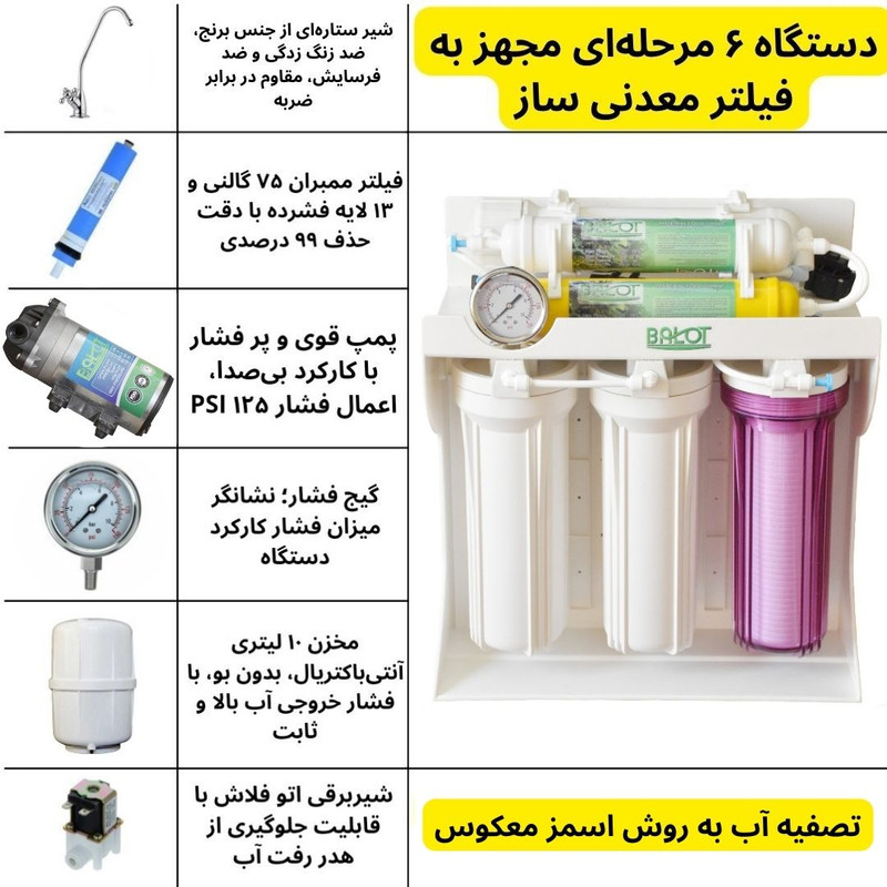 --حذف کامل شوری آب-- به همراه فیلتر ممبران با برند فیلمتک (FILMTEC) محصول شرکت داو (DOW) 100 درصد وارداتی با هولوگرام -- شیر ستارهای از جنس برنجی ضد زنگ، ضد فرسایش و مقاوم در برابر ضربه -- مجهز به فیلتر مینرال (تنظیم پی اچ و مواد معدنی آب) -- فیلتر ممبران 13 لایه با تراکم فشرده و دارای هولوگرام -- مجهز به شیر برقی جهت جلوگیری از هدر رفت آب -- دارای شیرمیکسر ( تنظیم دستی سختی آب) - بوستر پمپ بیصدا و بدون لرزش و پر قدرت -- فیلترهای گیاهی 100 درصد پوسته نارگیل -- مخزن آنتی باکتریال 10 لیتری - دارای متعلقات کامل نصب