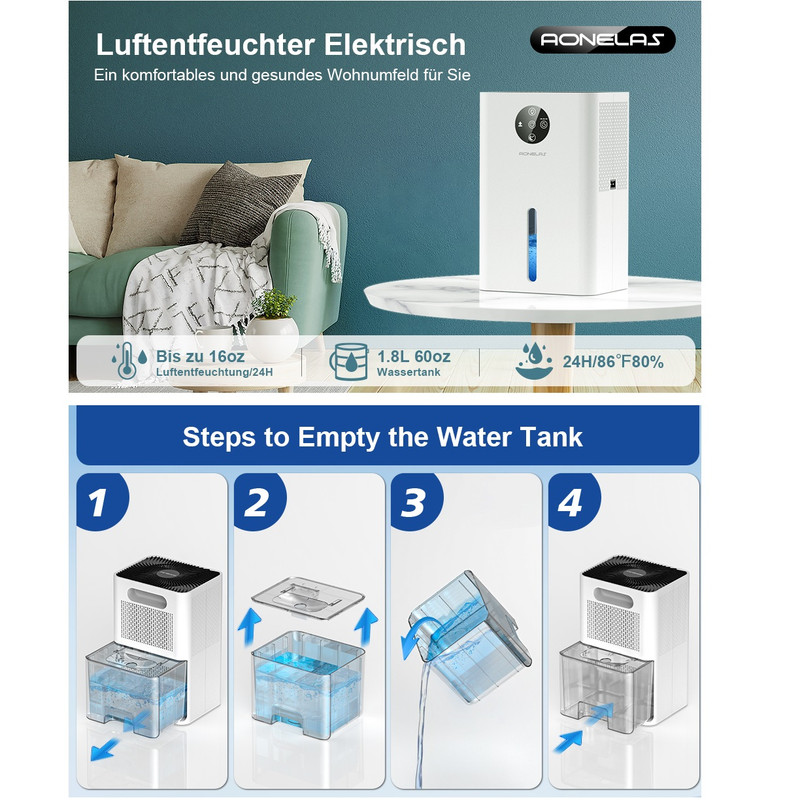 خاموش شدن خودکار و تنظیم زمان: رطوبت گیر مجهز به مخزن آب قابل مشاهده بزرگ 1.8 لیتری (60 اونس) است. هنگامی که مخزن پر است، رطوبت گیر قابل حمل به طور خودکار خاموش می شود و چراغ نشانگر به رنگ قرمز روشن می شود تا به شما یادآوری کند که آب را تعویض کنید. همچنین می توانید زمان تایمر را روی 6/8/10h تنظیم کنید و با گذشت زمان به طور خودکار خاموش می شود.