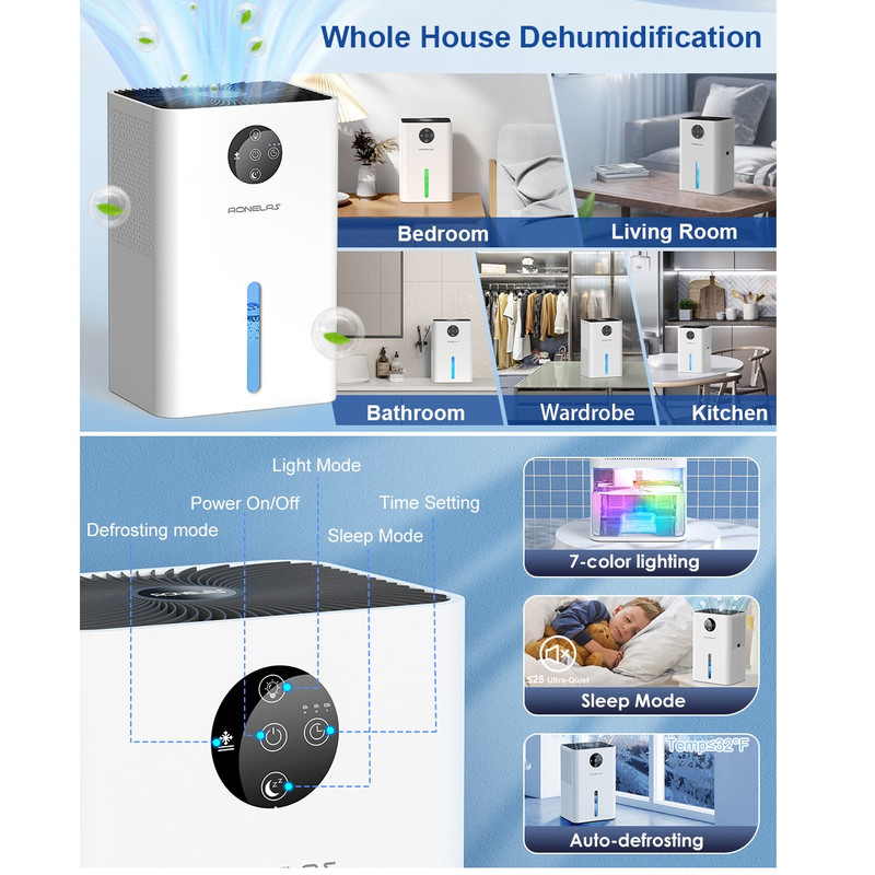رطوبت گیر کم مصرف: رطوبت گیر برقی ما با فناوری Peltier و تراکم نیمه هادی می تواند تا 450 میلی لیتر آب در روز را در دمای 86 درجه فارنهایت و 80 درصد RH حذف کند (ظرفیت رطوبت زدایی واقعی بسته به محیط متفاوت است). علاوه بر این، می توانید با مصرف برق 22.5 وات و عملکرد خاموش شدن خودکار، در مصرف برق بسیار صرفه جویی کنید.