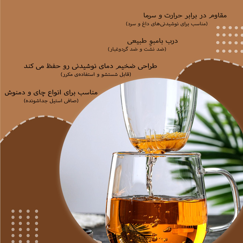 • جنس توری: پیرکس - توری شفاف برای دم کردن بهینه دمنوشها و چایها، با قابلیت حفظ طعم و کیفیت.
