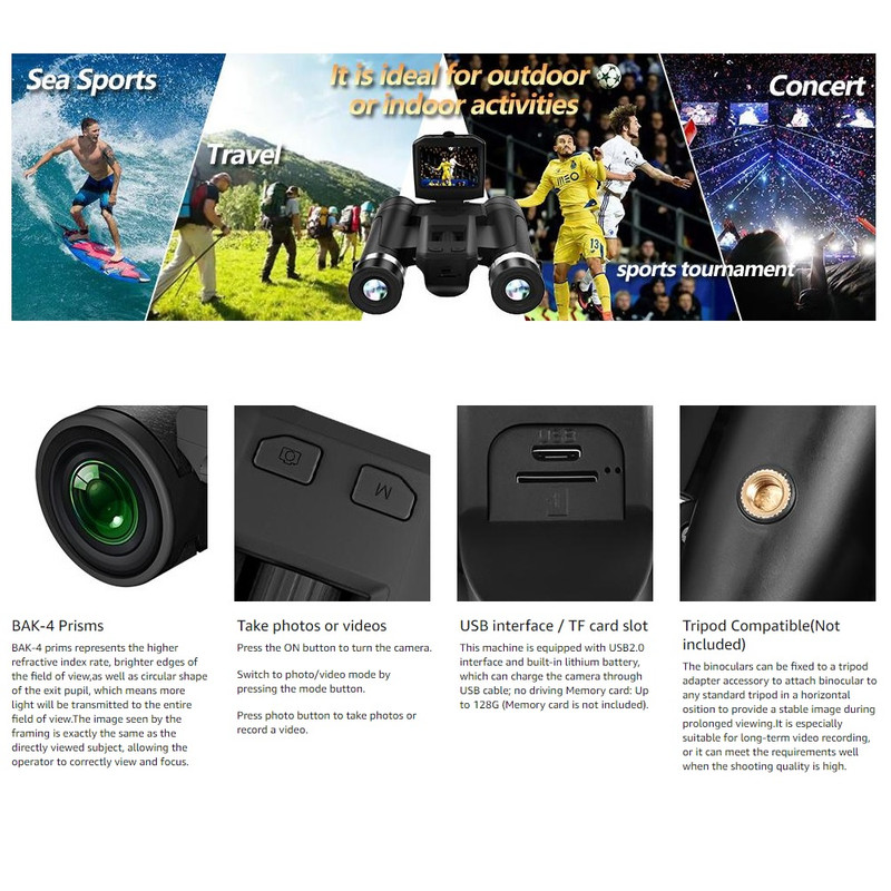 رابط USB / اسلات کارت TF این دستگاه مجهز به رابط USB2.0 و باتری لیتیومی داخلی است که می تواند دوربین را از طریق کابل USB شارژ کند. بدون رانندگی کارت حافظه: تا 128G (کارت حافظه شامل نمی شود).