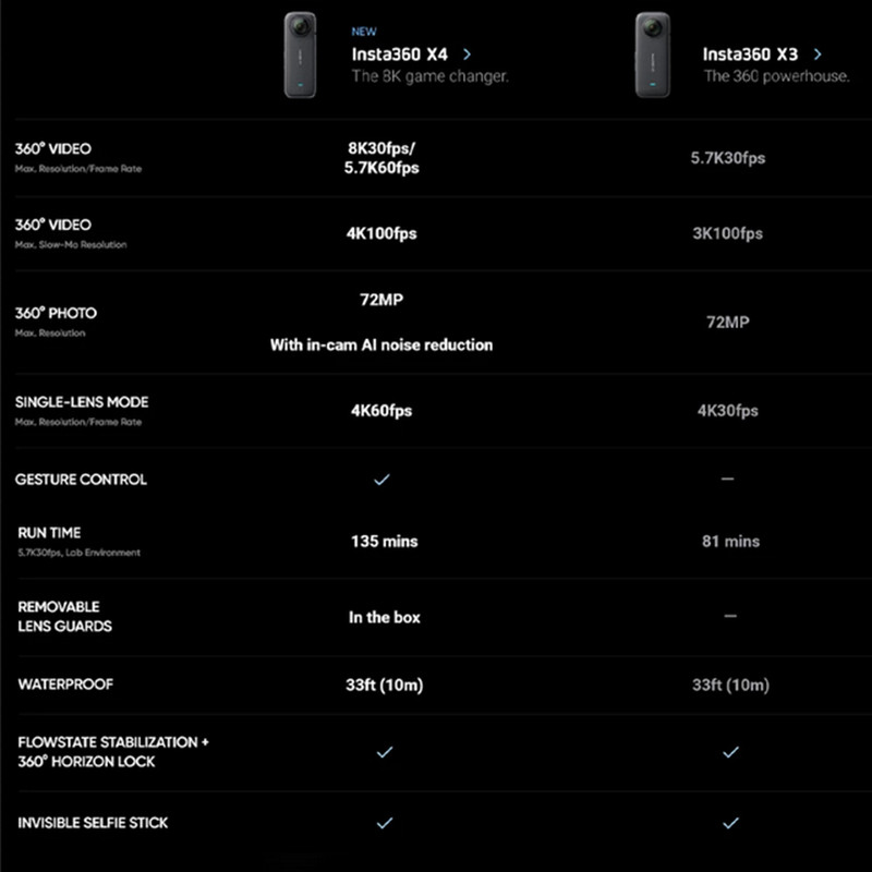 ۳۶۰º Mode: ۸K: ۷۶۸۰x۳۸۴۰@۳۰/۲۵/۲۴fps ۵.۷K+: ۵۷۶۰x۲۸۸۰@۳۰/۲۵/۲۴fps ۵.۷K: ۵۷۶۰x۲۸۸۰@۶۰/۵۰/۳۰/۲۵/۲۴fps ۴K: ۳۸۴۰x۱۹۲۰@۱۰۰/۶۰/۵۰/۳۰/۲۵/۲۴fps Single-Lens Mode: ۴K: ۳۸۴۰x۲۱۶۰@۶۰/۵۰/۳۰/۲۵/۲۴fps ۲.۷K: ۲۷۲۰x۱۵۳۶@۶۰/۵۰/۳۰/۲۵/۲۴fps ۱۰۸۰p: ۱۹۲۰x۱۰۸۰@۶۰/۵۰/۳۰/۲۵/۲۴fps Me Mode: ۴K: ۳۸۴۰x۲۱۶۰@۳۰/۲۵/۲۴fps ۲.۷K: ۲۷۲۰x۱۵۳۶@۱۲۰/۱۰۰/۶۰/۵۰fps ۱۰۸۰p: ۱۹۲۰x۱۰۸۰@۱۲۰/۱۰۰/۶۰/۵۰fps