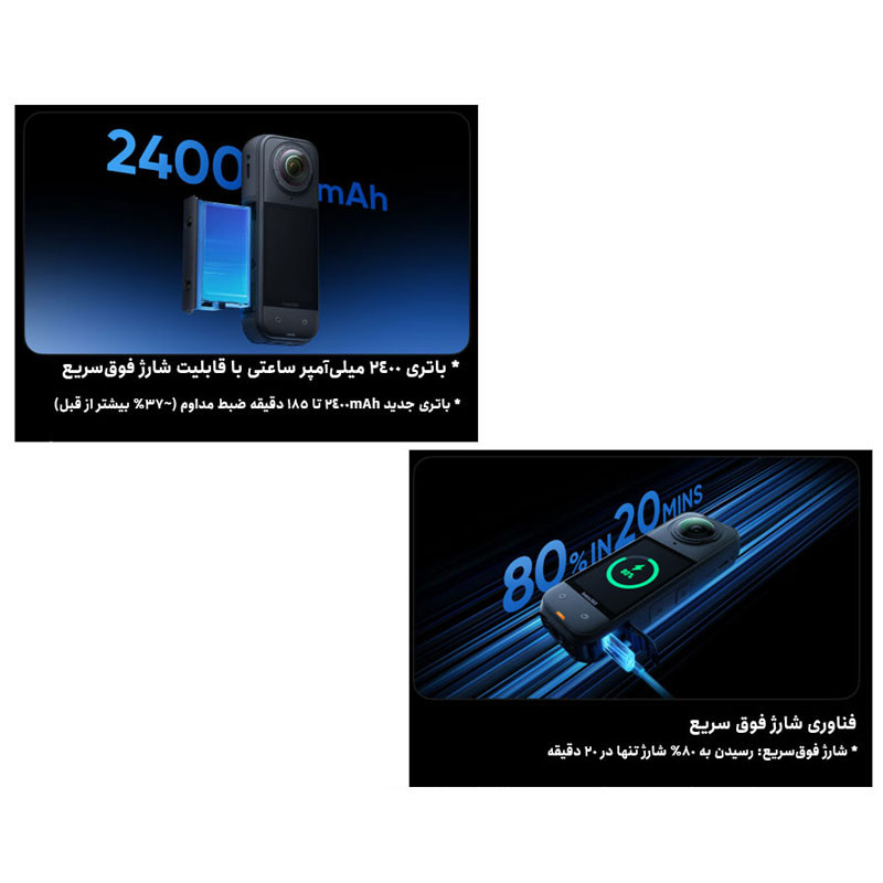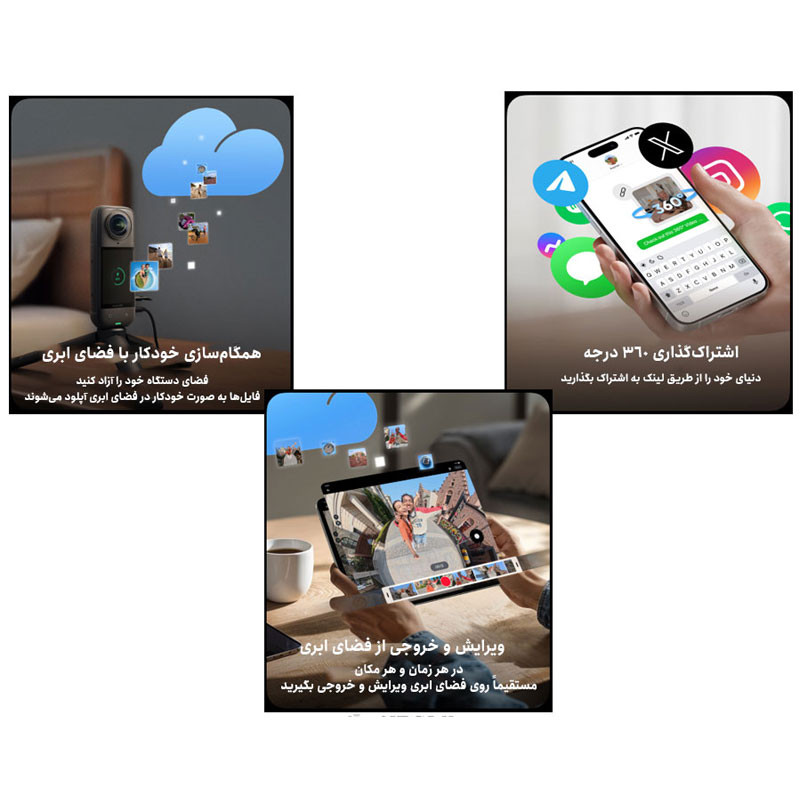 ویدیو 8K با کیفیت سینمایی:امکان ضبط ویدیوهای ۳۶۰ درجه با وضوح 7680×3840 پیکسل — تصاویری زنده، دقیق و واقعگرایانه که هیچ لحظهای از چشم شما پنهان نمیماند / ثبت تصاویر ۳۶۰ با کیفیت فوقالعاده:قابلیت عکاسی با رزولوشن تا 72 مگاپیکسل برای ایجاد تصاویری حرفهای و چاپپذیر، مناسب برای تولید محتوای تبلیغاتی، تور مجازی، مستند و… / لرزشگیر دیجیتال FlowState: