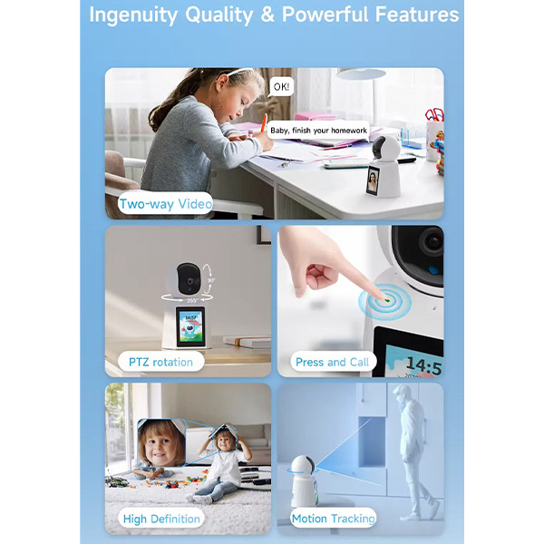 مکاامه تصویری (به صورت دو طرفه) - دارای میکروفون داخلی و مکالمه صوتی دو طرفه - قابلیت چرخش دوربین از طریق گوشی - قابلیت تعقیب سوژه - قابلیت ارسال نوتیفیکیشن ، تصویر برداری و فعال شدن آژیر در صورت ورود شخص غیر مجاز - امکان ضبط فیلم و عکس از طریق گوشی موبایل - دارای شیار مخصوص کارت حافظه - دارای قابلیت تنظیم سرعت چرخش دوربین- دید در شب