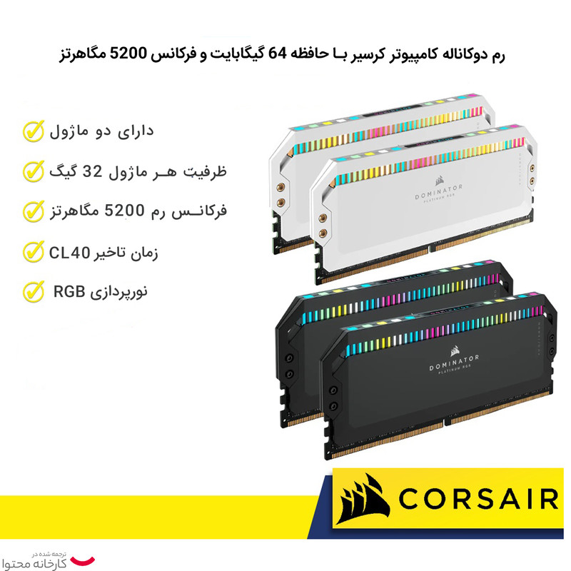 رم دسکتاپ DDR5 دو کاناله 5200 مگاهرتز CL40 کورسیر مدل Dominator Platinum RGB ظرفیت 64 گیگابایت