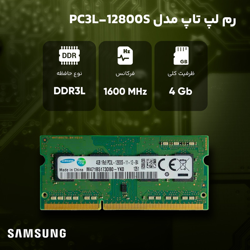 رم لپ تاپ DDR3L تک کاناله 1600 مگاهرتز سامسونگ مدل PC3L-12800 ظرفیت 4 گیگابایت