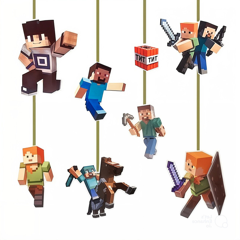 آویز سقفی ماین کرافت از 8 تکه شکل های مختلف تم ماین کرافت تشکیل شده که به وسیله ربان از سقف آویزان می شود.