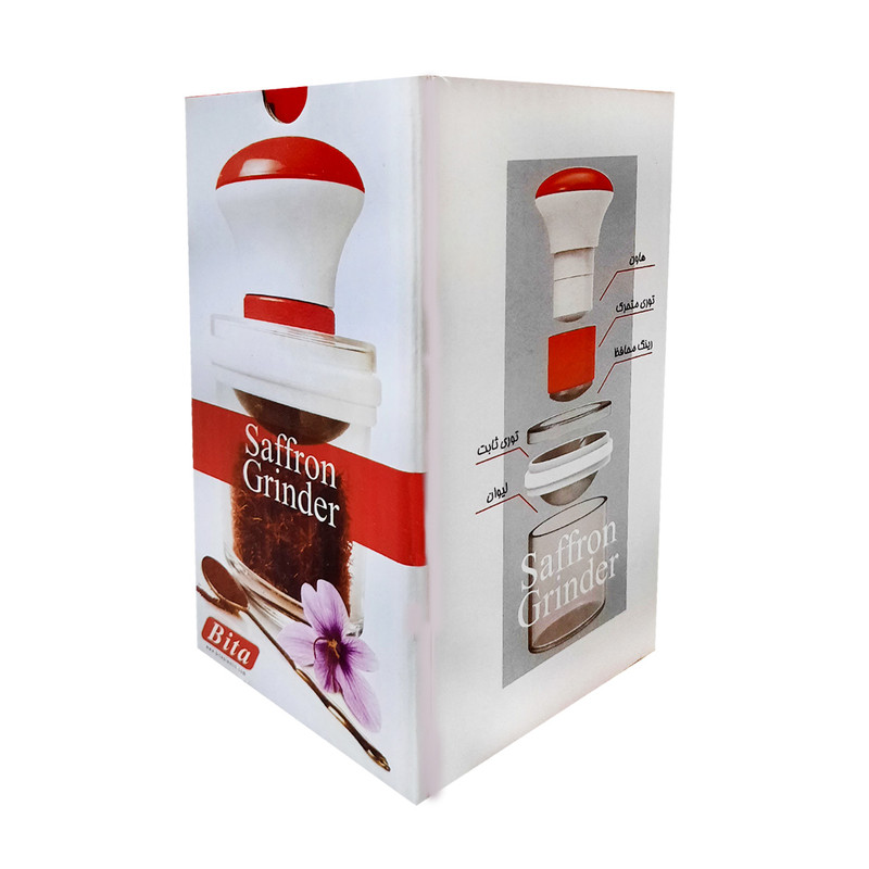 - زعفران ساب بیتا شامل هاون، توری متحرک و ثابت، رینگ محافظ، و لیوان می باشد.
