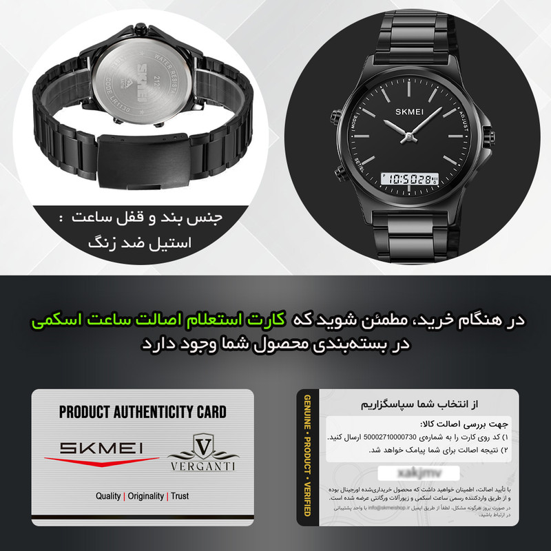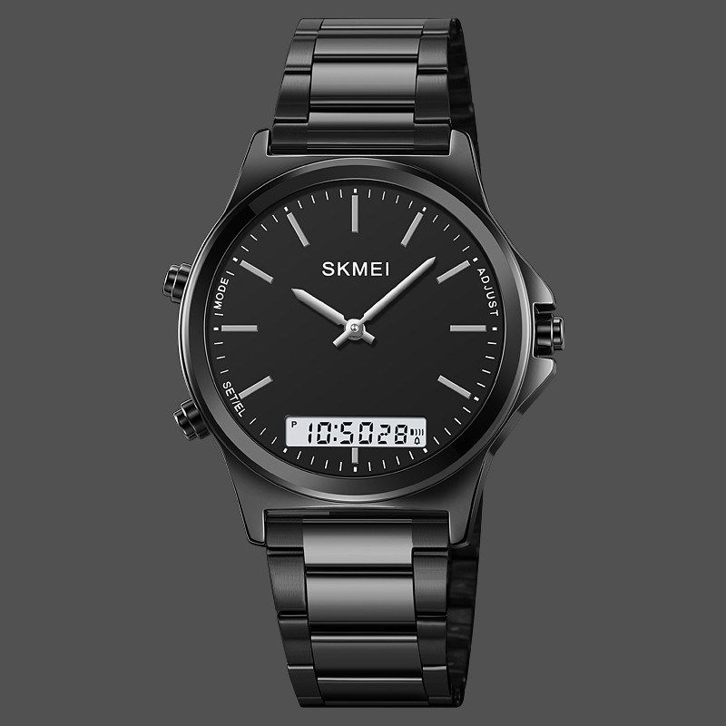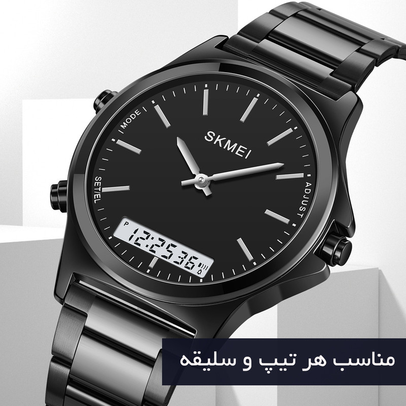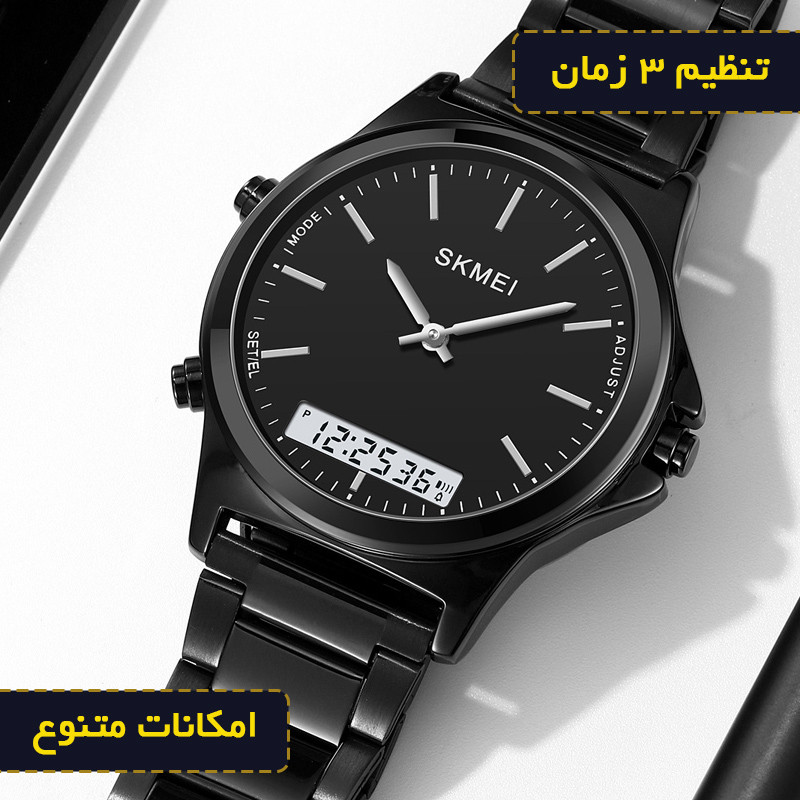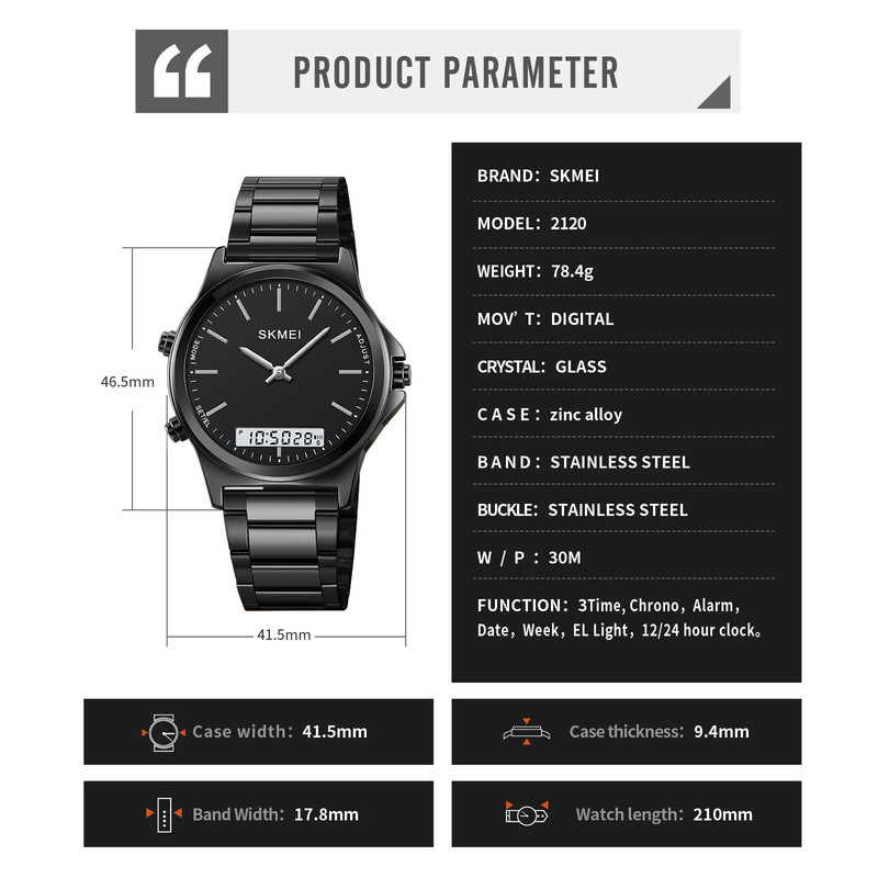 ساعت دوزمانه اسکمی مدل ۲۱۲۰ ترکیبی از استایل شیک و فناوری کامل است. این ساعت تمام مشکی با بدنه آلیاژ روی و بند فولاد ضدزنگ، دارای امکاناتی چون نمایش سه زمان، کرنومتر، آلارم، تاریخ و نور پس زمینه است و تا عمق ۳۰ متر در برابر آب مقاوم میباشد.