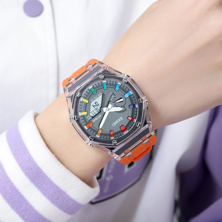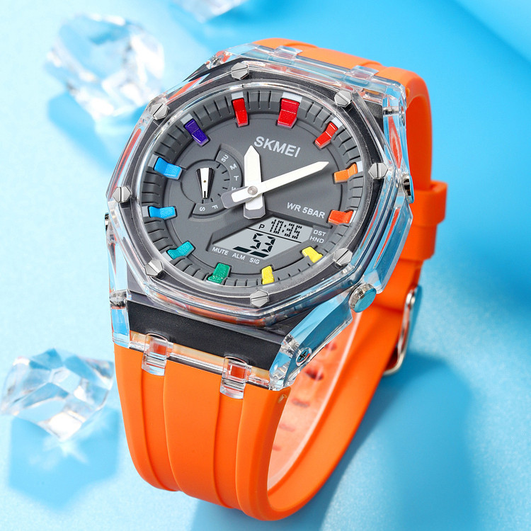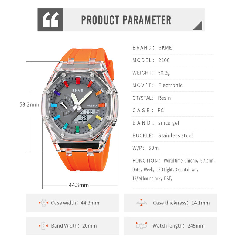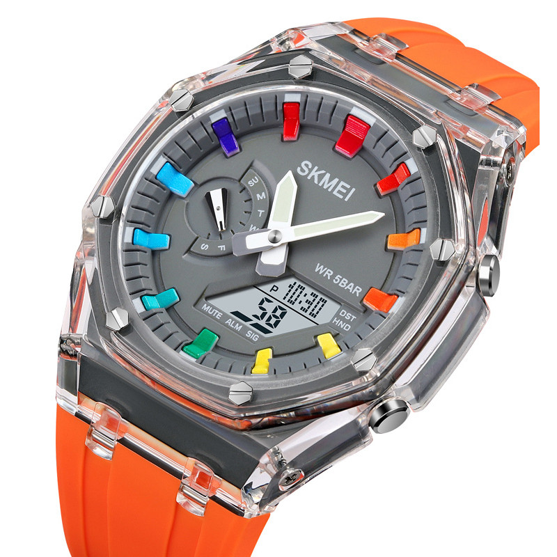 ساعت مچی اسکمی مدل 2100 OG با جزئیات شگفتانگیز خود، یک انتخاب مناسب برای علاقهمندان به طراحیهای دیجیتال و ویژگیهای کارآمد است. این ساعت با بند سیلیکونی نارنجی، نه تنها ظاهری جذاب دارد بلکه از جنسی پرقدرت و با دوام استفاده میکند.