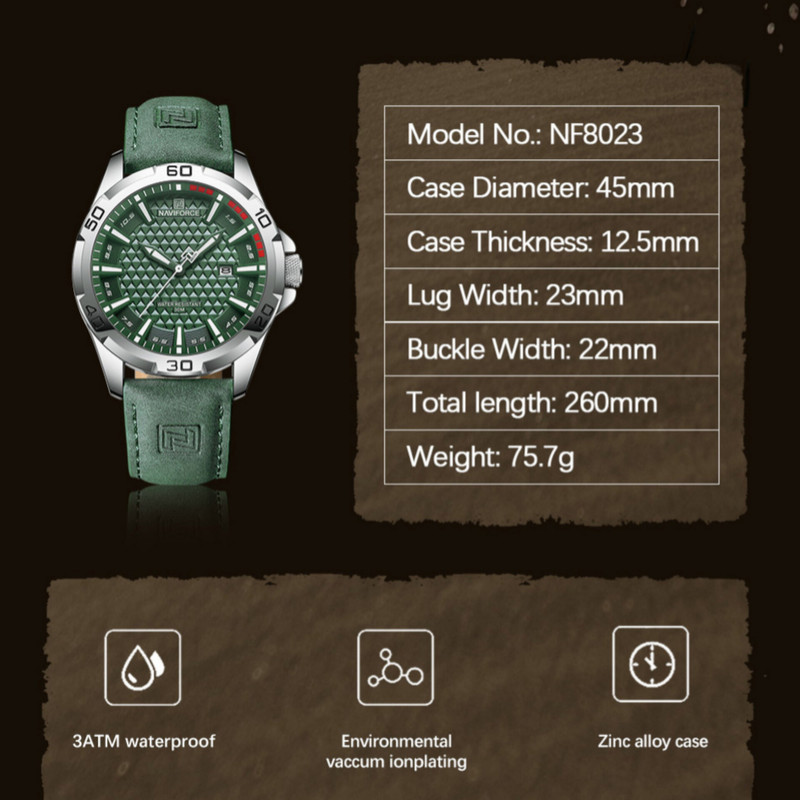 دارای سرکوک مارکدار،ثانیه شمار طرح لوگوی نیوی فورس،حک برند بر روی صفحه،قفل،بند و پشت درب. دارای هولوگرام،دفترچه،اتیکت و جعبه طبق تصاویر. همچنین یک عدد باتری اضافه همراه کالا ارسال میشود.