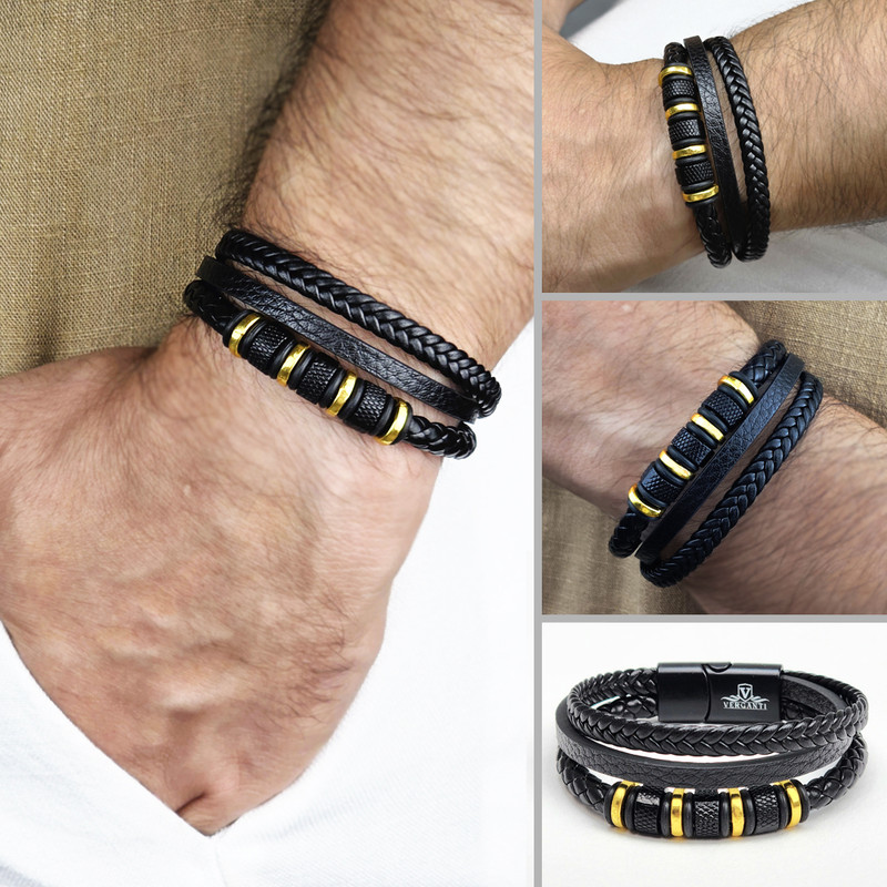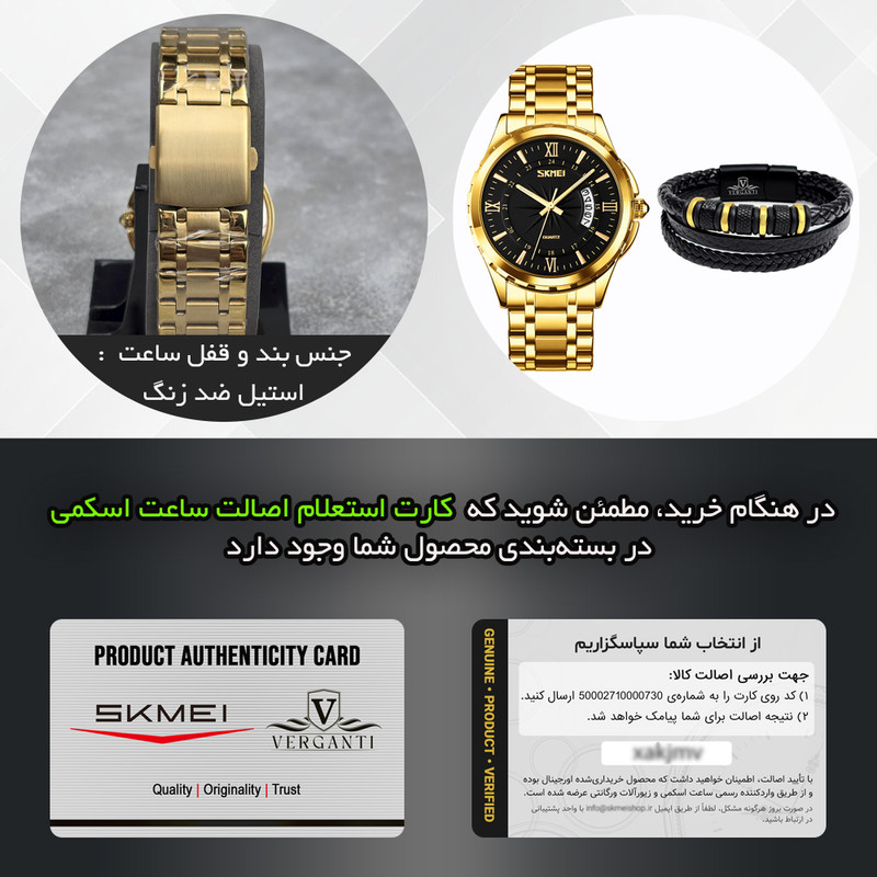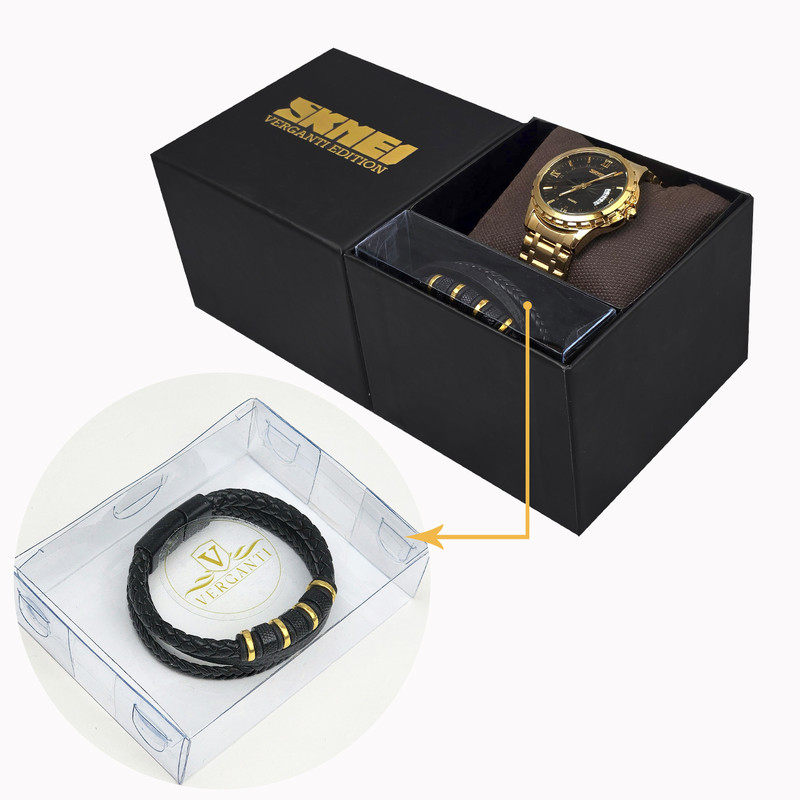ست ساعت طلایی SKMEI 9069 و دستبند چرمی Verganti ظاهری کلاسیک و هماهنگ ارائه میکنند. ساعت با موتور ژاپنی، بند و قفل استیل طلایی و مقاومت ۳۰ متری در برابر آب، دوام و وقار دارد و دستبند Verganti با جزئیات طلایی و قفل مگنتی، همراهی ساده اما متمایز برای استایل شماست.