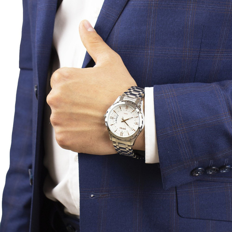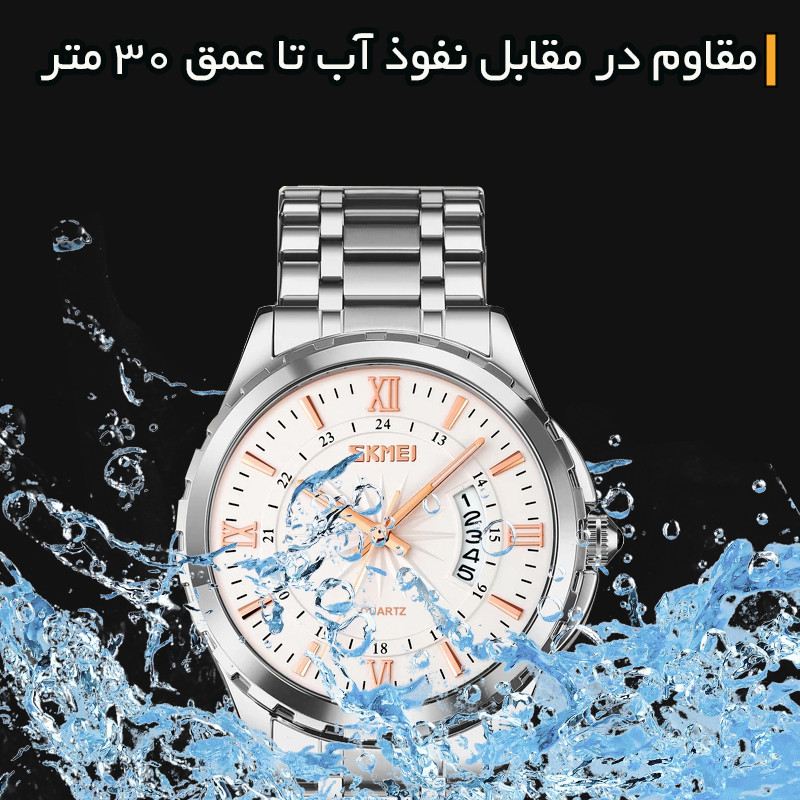 این مجموعه شامل ساعت مدل 9069 اسکمی با بند استیل، نمایش تاریخ و مقاومت آب تا 30 متر، و دستبند چرمی قهوهای مشکی ورگانتی با طراحی چندلایه و مهرههای جذاب است که استایل و راحتی را به شما هدیه میدهد.