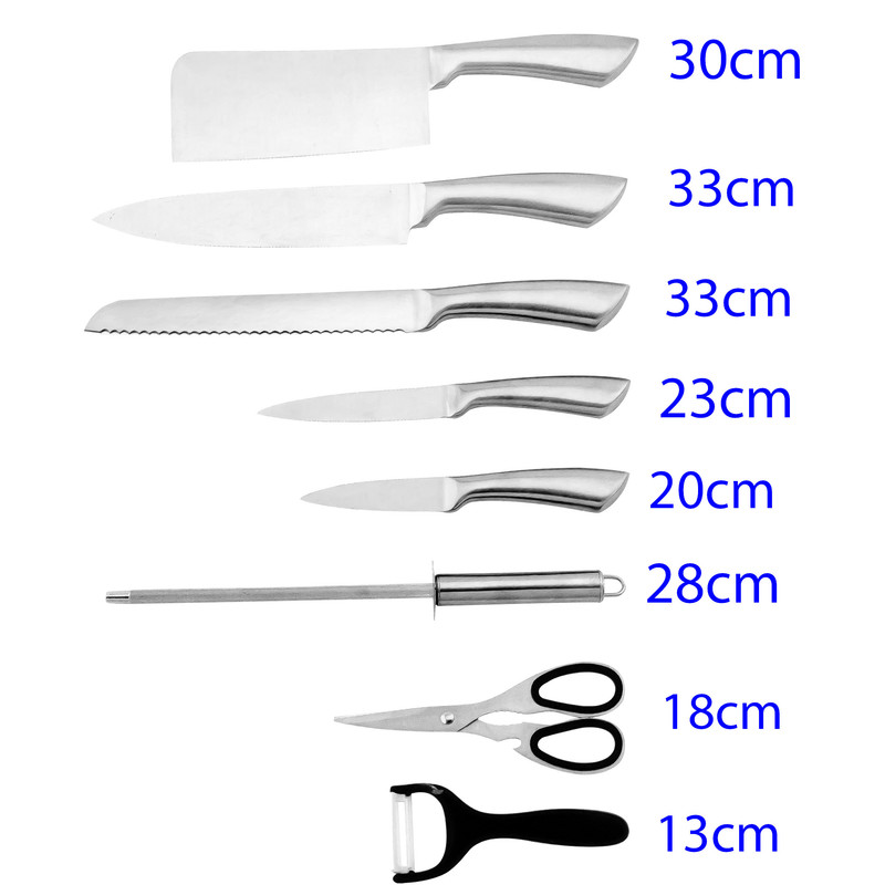 تیز و برنده - کاملا ضد زنگ - ابعاد ساطور : 30 سانتی متر - ابعاد چاقوی آشپزخانه : 33 سانتی متر - ابعاد چاقوی چاقوی برش نان : 33 سانتی متر - ابعاد چاقوی همه کاره : 23 سانتی متر - ابعاد چاقوی پوست کن : 20 سانتی متر - ابعاد سوهان : 28 سانتی متر - ابعاد قیچی : 18 سانتی متر - ابعاد پوست کن : 13 سانتی متر