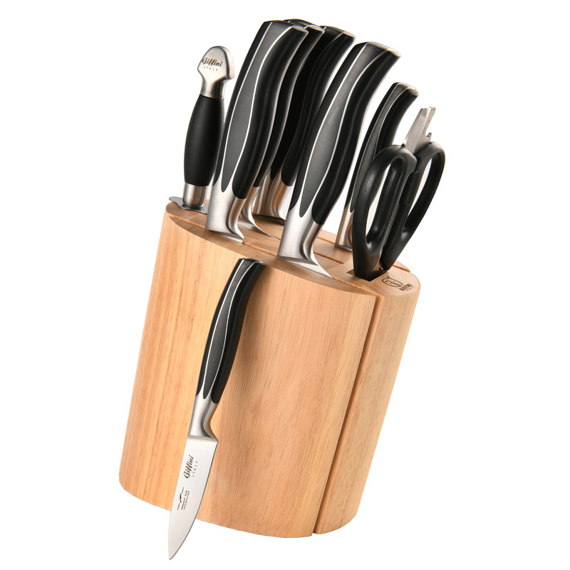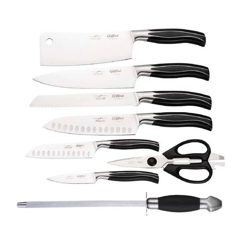 تیز شده توسط لیزر بسیار دقیق -جنس تیغه ها وانادیوم اصل میباشد -دسته و بدنه یک تکه و سرهم میباشد و امکان جدا شدن را هرگز ندارد. - پایه قابل شستشو میباشد. -کاردها ساخت شرکت GIFFINI میباشد شامل :ساطورC;EAVER: طول کلی ۳۲، طول تیغه ۱۹ سانتیمتر - چاقو برش سایز ۱: طول کلی ۱۹.۵، طول تیغه ۸.۲ سانتیمتر - چاقو برش نان: طول کلی ۳۲، طول تیغه ۱۹ سانتیمتر - چاقو برش سایز ۳: طول کلی ۲۳، طول تیغه ۱۱.۵ سانتیمتر - چاقوی سرآشپز: طول کلی ۳۲، طول تیغه ۱۹ سانتیمتر -چاقوی برش سایز ۴:طول کلی۲۸.طول تیغه ۱۹ سانتی متر - -قیچی آشپزخانه: طول کلی ۲۵ سانتی متر -پایه کارد -تیزکن