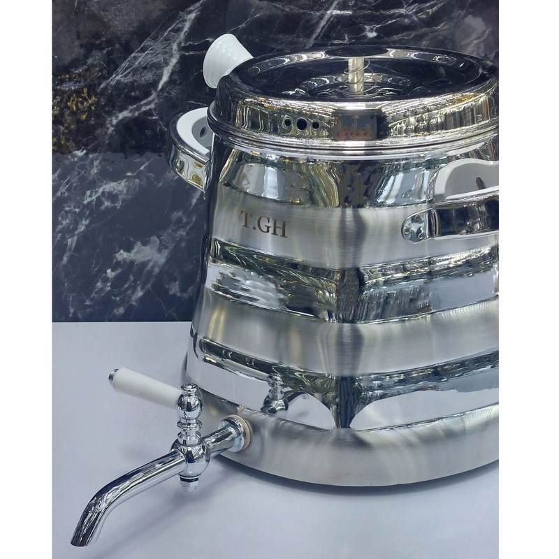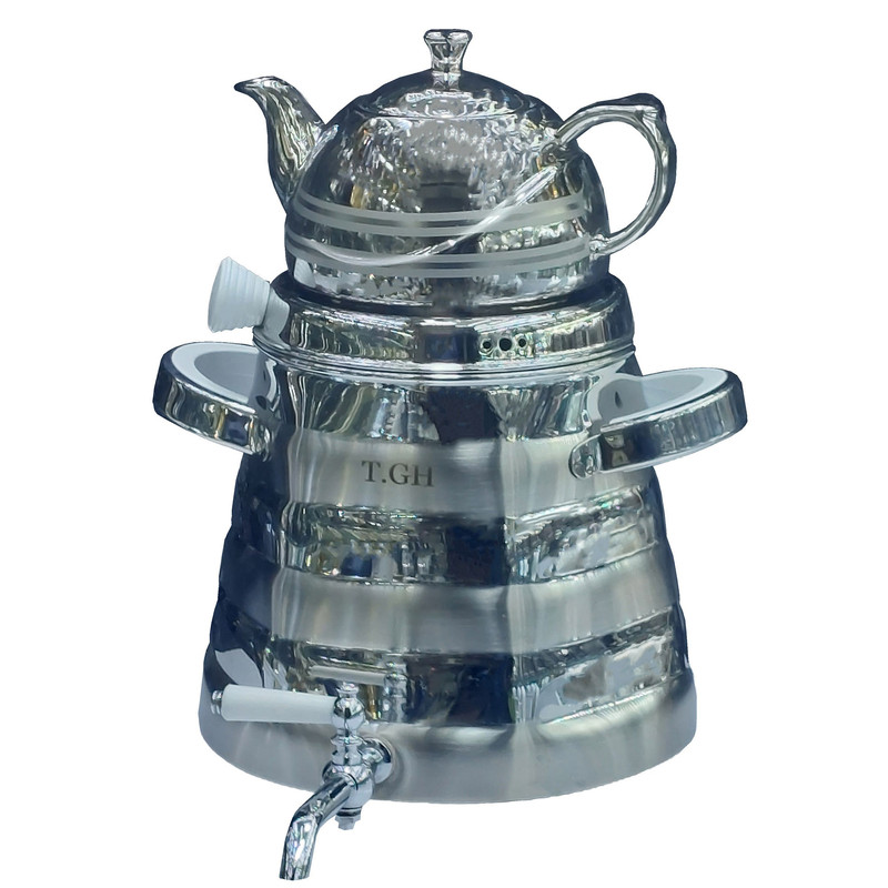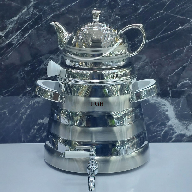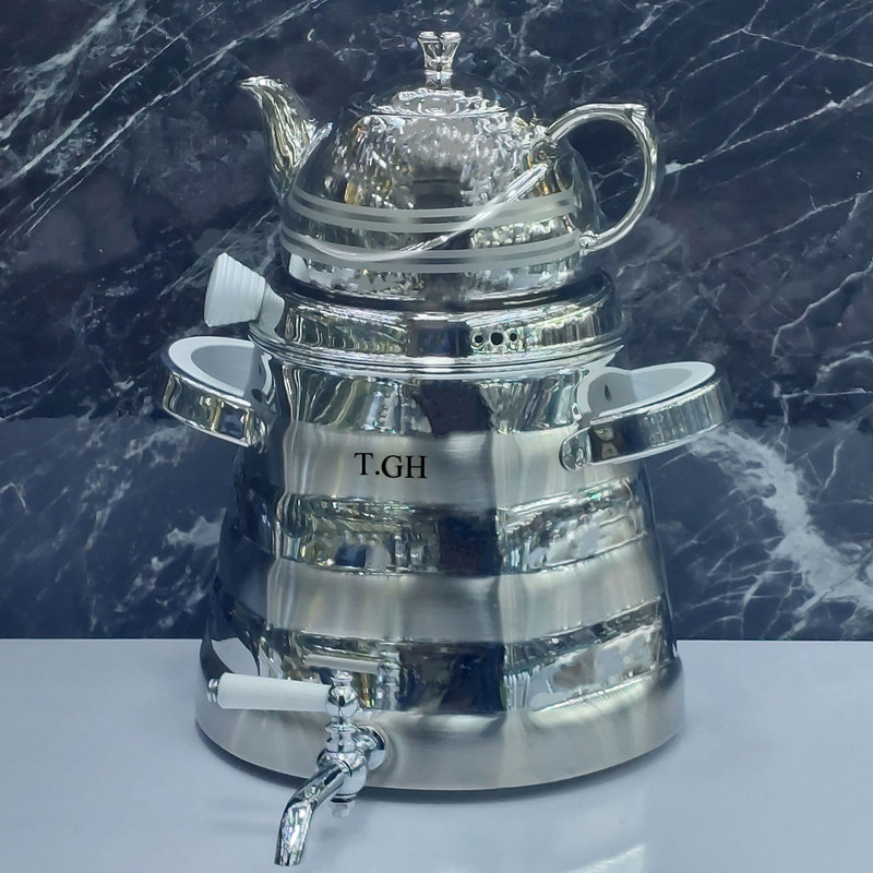 قوری این ست با پوشش کروم می باشد که به زیبایی با کتری هماهنگ شده و از چینی درجه یک تولید شده است که عطر و طعم چای را حفظ و رنگ آن را سیاه نمی کند.